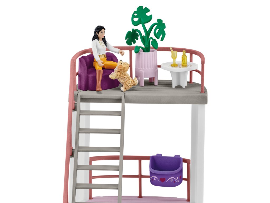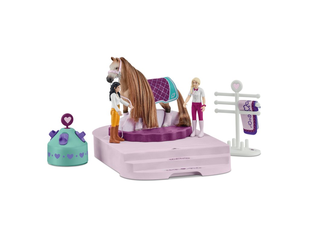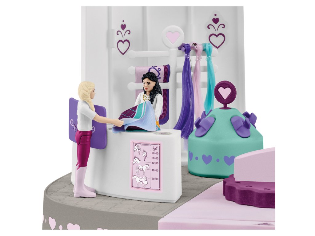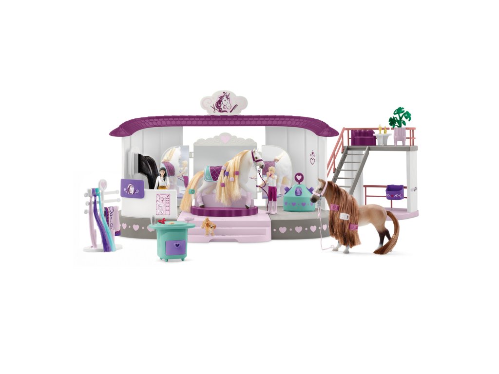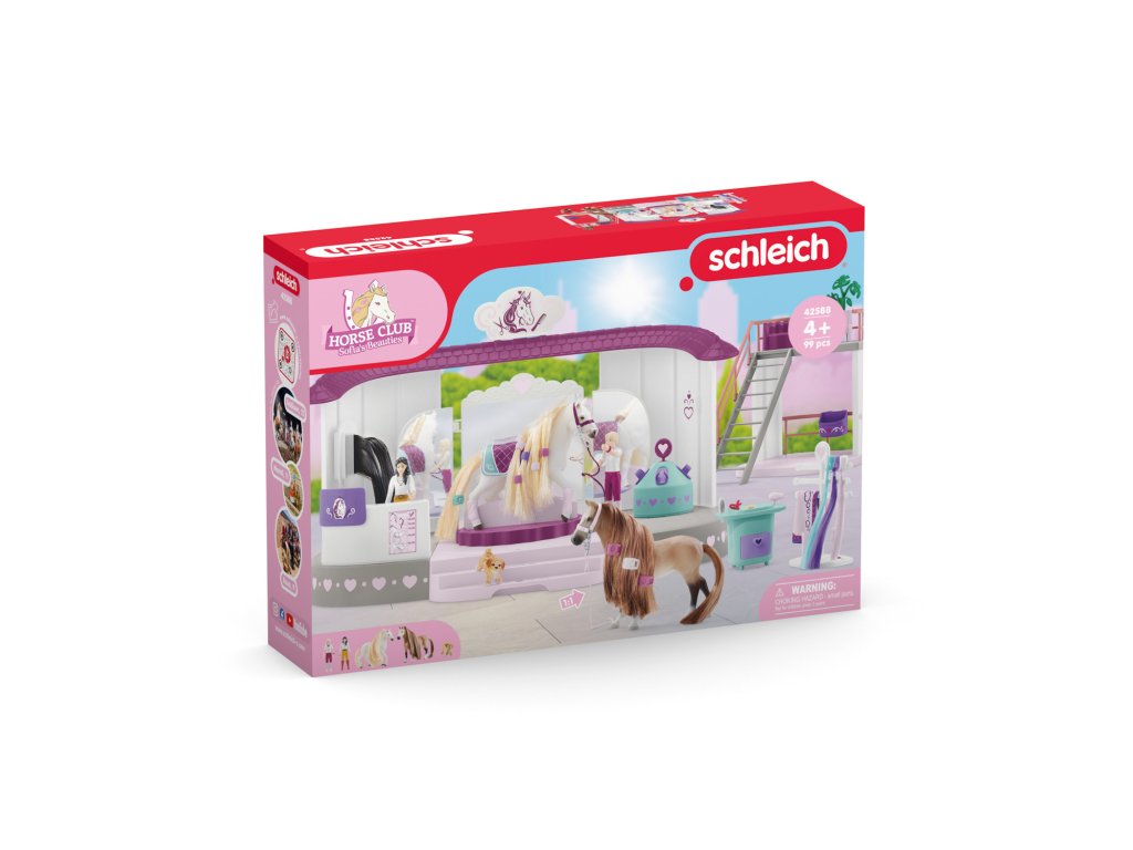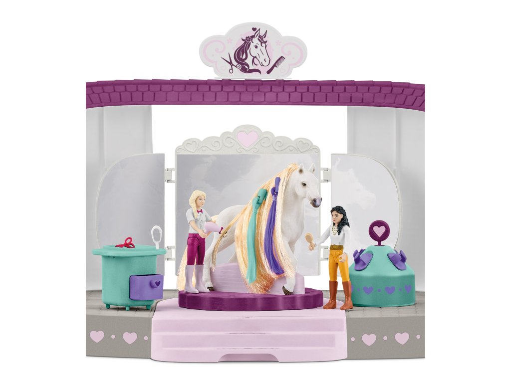 Jejda… S takovou nabídkou je těžké si vybrat: oslava ve stáji, narozeniny koně nebo první školní den nejmladšího hříběte – v Salonu krásy z kolekce Schleich® HORSE CLUB Sofia's Beauties najdeš vše, co si jen můžeš přát pro každou koňskou příležitost. A díky krejčovství si mohou nechat každý doplněk ušít i na míru. Malá hříbata, sportovní poníci i mohutní hřebci tak mohou hrdě předvést své nové oblečení na pódiu. Pod ním najdeš šuplík, do kterého můžeš uložit všechny doplňky do hřívy, sponky a korálky. Víš, že hřívu a ocas každého koně můžeš snadno vyměnit a taky je můžeš kartáčovat? To není špatné, co? A po všem tom pózování si zvířata zaslouží spoustu čerstvého sena v útulné čekárně. K dostání je i skvělá limonáda. Ale ta je tu pouze pro jezdce. Sada obsahuje: 1× kůň Blossom s hřívou a ocasem, 1× trakénská klisna s kartáčovatelnou hřívou a ocasem, 1× štěně plemene Maltipoo, 1× plně pohyblivá figurka Sofie, 1× plně pohyblivá figurka paní Lopez-Mitchellové, 1× salon s otočným stolem. Rozměry: 34,5 x 49 x 10,5 cm Věk: 3+