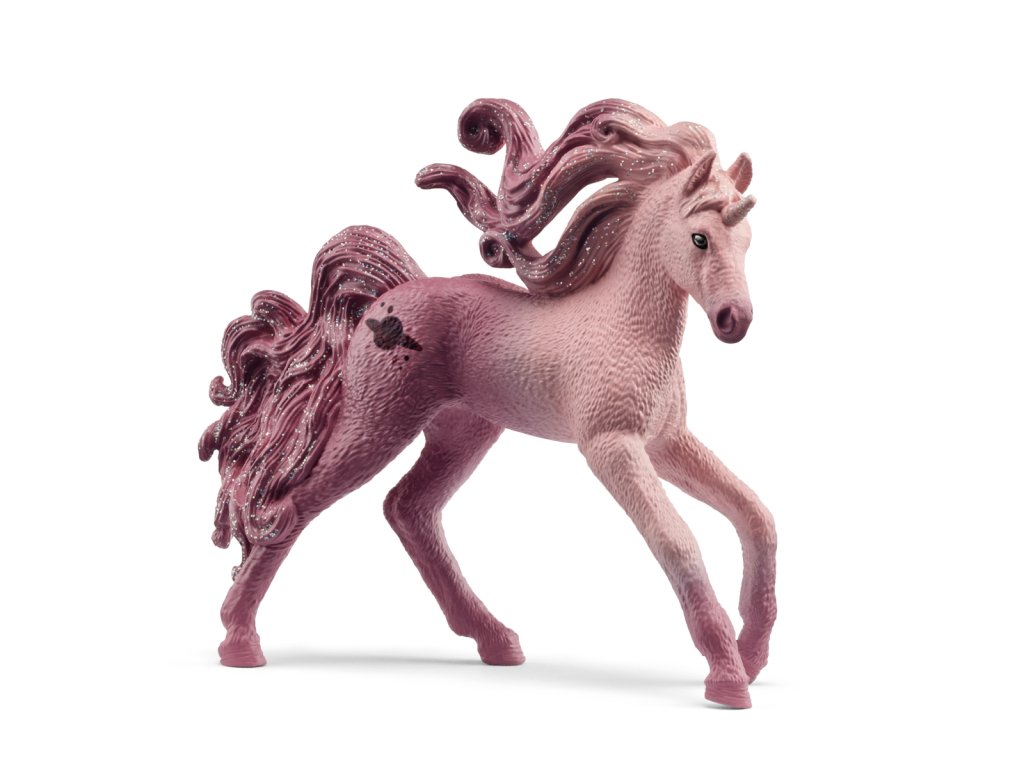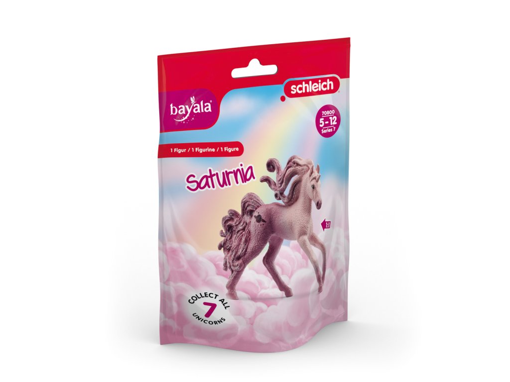 Sběratelský jednorožec Saturnia ze světa BAYALA. Se svou třpytivě fialovou hřívou a ocasem vypadá úžasně. Na boku má krásné tetování. Fialovou barvu skvěle doplňuje jeho majestátní růžová srst s rohem. Rozměry: 16,1 x 2,5 x 12,4 cm. Věk: 5-12