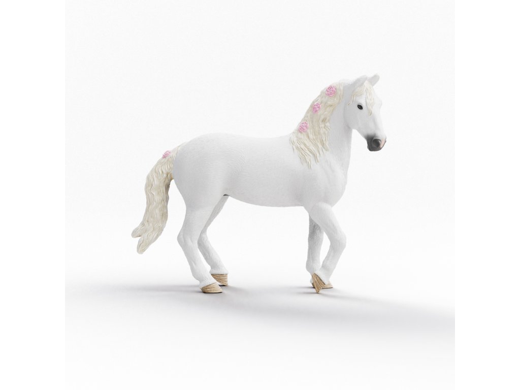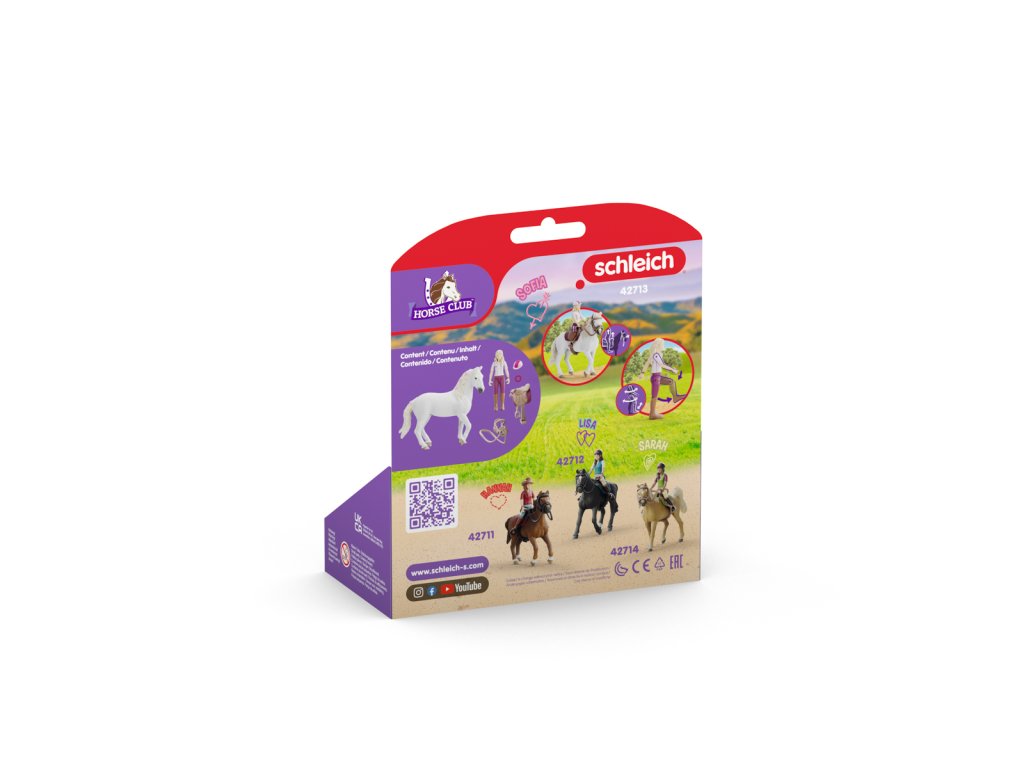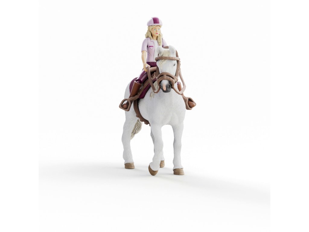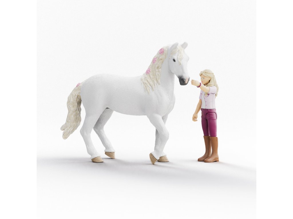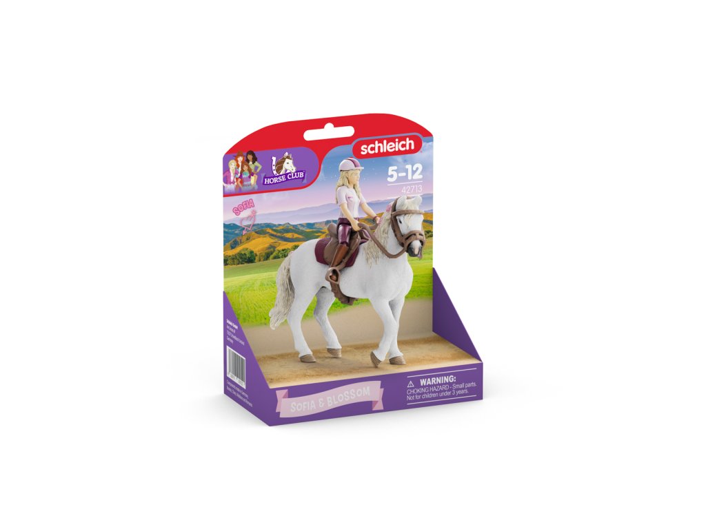 Sofia a Blossom jsou opět hvězdami kryté arény Peppertree. Sněhově bílá arabská klisna s ladnou chůzí je už teď úžasná. Sofii však velmi těší, že je její kůň ještě hezčí. Pořád vymýšlí nové účesy. Dnes má Blossom ve své svěží bílé hřívě růžové květy. Aby se účes ani u jedné nepoškodil, volí dnes raději pomalejší tempo. Těžko říct, která z nich je hezčí. Sofia i Blossom vypadají prostě rozkošně. Sofie do hřívy a ocasu své elegantní arabské klisny zapletla jemné květy. Je naprosto okouzlující. Barevně sladěná je i deka pod sedlem a Sofiino jezdecké oblečení a přilba. Figurka Sofie je plně pohyblivá. Figurka sedlo a uzda jsou odnímatelné. Obsah: 1× figurka Sofia, 1× kůň Blossom, 1× helma, 1× uzda s otěžemi, 1× sedlo, 1× náramek, 1× sedlo. Tento výrobek Schleich® patří do tematického světa HORSE CLUB a je vhodný pro děti ve věku od 5 do 12 let. Rozměry hračky: 10,9 x 3,6 x 13 cm. Rozměry balení: 18 x 15,5 x 8,2 cm.
