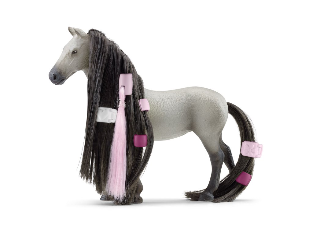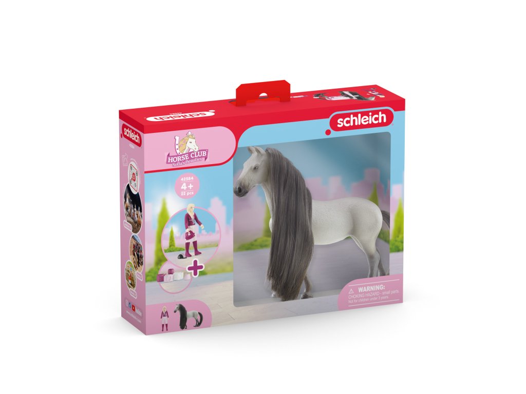 Výborně! Naše plně pohyblivá figurka Sofie a její trakénská klisna Dusty ze startovací sady Sofia a Dusty u kolekce Schleich® HORSE CLUB Sofia's Beauties jsou skutečnými kamarádkami na celý život. Obě se setkaly v jízdárně, kde Sofii láskyplně pobídl přátelský kůň. Od té doby jsou obě nerozlučné. Něco jako kečup a hranolky nebo škola a domácí úkoly. Jen lepší. Mnohem lepší. Obě dvě spolu rády vymýšlejí nové účesy pro Dusty. Vidíš všechny ty barevné sponky a korálky? Je téměř nemožné říct, která je nejhezčí. Nebo už máš svého favorita? Hřívu a ocas lze naštěstí snadno vyměnit, kdykoli se ti zachce, takže můžeš účes dokonale sladit s oblečením. Třeba když je deka na koně, která k němu ladí, zrovna v pračce. Vyzkoušej to a uvidíš! Sada obsahuje: 1× trakénská klisna s kartáčovatelnou hřívou a ocasem, 1× plně pohyblivá figurka Sofie, 1× deka pro koně, 1× jezdecký klobouk, 1× sponka do hřívy, 1× korálky do hřívy, 1× příčesek, 1× kartáč. Rozměry: 18,7 x 24,5 x 6 cm Věk: 3+