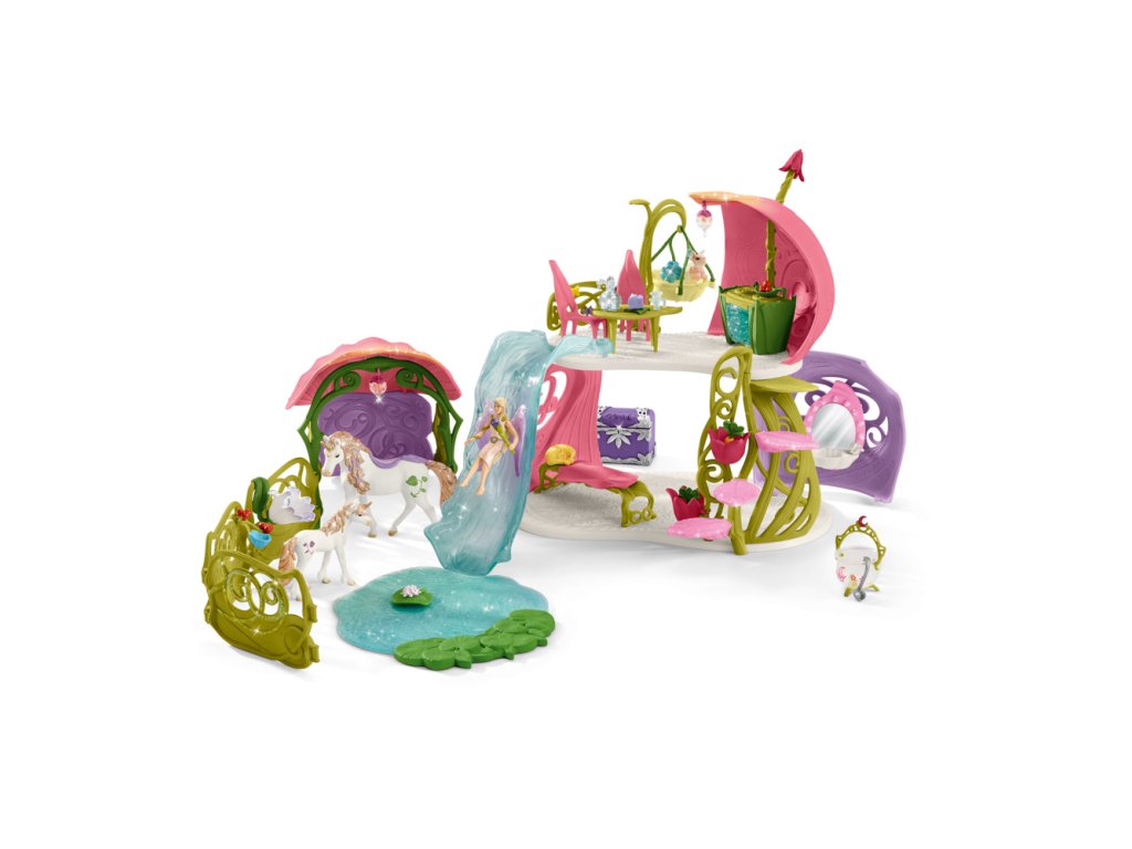 Třpytivý květinový dům s jednorožci, jezerem a stájí