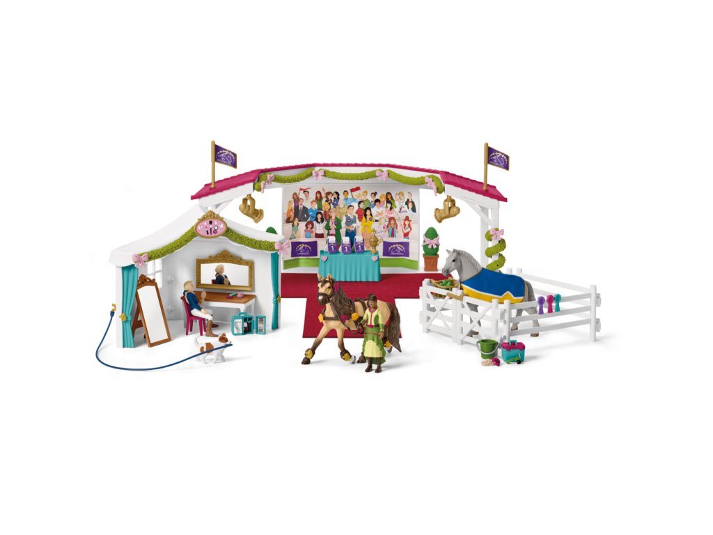 V Lakeside se koná velká koňská show Schleich® Horse Club! Sarah a Tori čistí svou vycházkovou klisnu Tennessee a hřebce Lusitano kartáčem z boxu pro péči o koně Ze zadní strany arény si přinesly ozdobná srdce, mašličky a květiny, které si nasadili na uzdu a postroj. Ve stanu si dívky před zrcadly malují rty, štětcem nanášejí make-up z kompaktního z pouzdra na líčení. Venku je aréna zdobena květinami, mašlemi a vlajkami. Je čas na show! Sarah si upraví sukni, zatímco Tori sundá deku ze svého koně. Pod reflektory vedou koně z výběhu a přes koberec ke stolu poroty. Co bude na výsledkových tabulkách? Rubyho štěně způsobuje na výstavě koní veselý chaos, když chytí hadici. Fantastické soupravy obohacují svět Horse Club vhodné pro hru ve věku 5-12 let. Ozdoby lze připojit v libovolné konfiguraci! Figurky mají pohyblivá ramena. Sada obsahuje spoustu doplňků: 2x holky, 1x vycházkový kůň Tennessee, 1x štěně, 1x show aréna, 2x bodová světla, 3x vysvědčení, 1x stan a závěsy, 1x zavěšené zrcadlo, 1x stojící zrcadlo, 1x kartáč, 1x rtěnka, 1x štětec na líčení , 1x make-up kompaktní, 1x make-up sada, 1x stůl pro porotu, 2x točitá réva, 7x zakřivená réva, 8x rovné mašle, 4x rohové mašle, 2x stuhy stromových stromů, 6x ozdobné květiny, 6x ozdobné srdce, 6x dekorace, 6x dekorativní růže, 6x dekorativní mašle, 6x dekorativní koňské hlavy, 1x uzda, 1x lano, 1x postroj, 4x řemeny, 2x brány plotu se šrouby, 3x ploty, 1x kbelík, 1x jablko, 2x vlajky, 2x květináč, 1x stůl , 1x box na péči, 1x stojan na seno, 1x fialová rozeta, 1x tyrkysová rozeta, 1x růžová rozeta, 1x židle, 1x kartáč na kopyta, 1x kartáč, 1x hadice, 1x kohoutek, 1x trofej, 1x hřeben, 1x sukně, 1x koňská deka , 1x plstěný koberec, 1x sloupeček s tabulkou, 1x samolepka, 1x návod. Rozměr balení: 49 x 10,5 x 34,5 cm. Nevhodné pro děti do 3 let. Video: https://www.youtube.com/watch?v=0d76wwee6z8