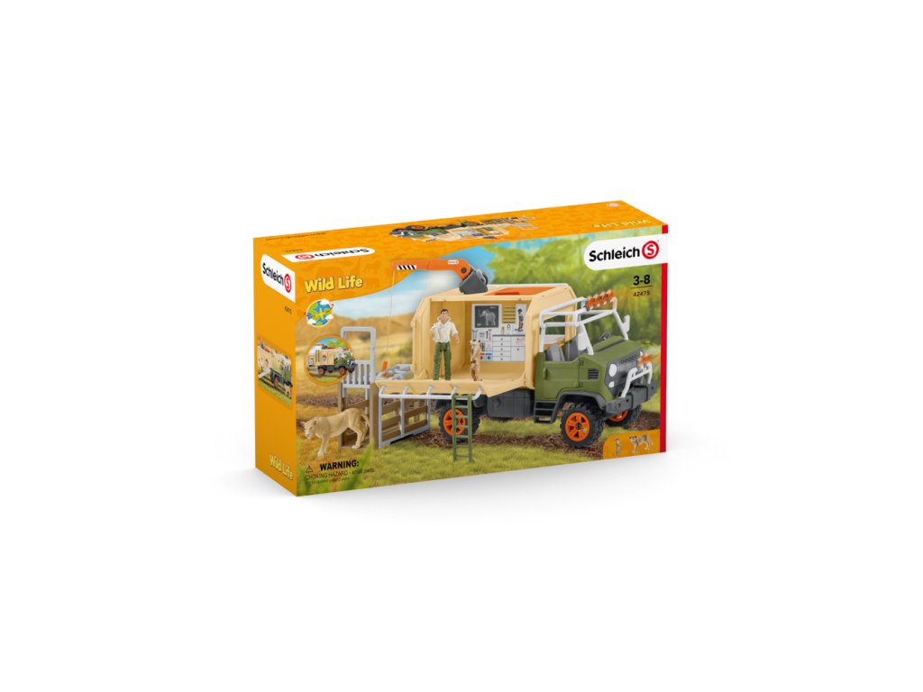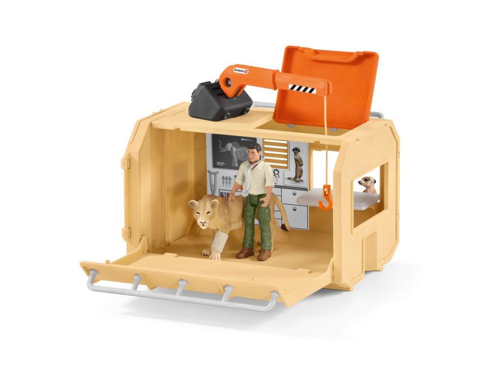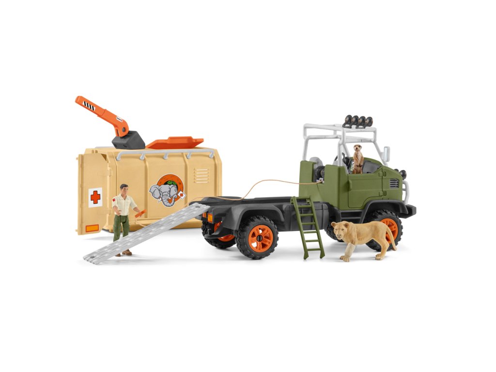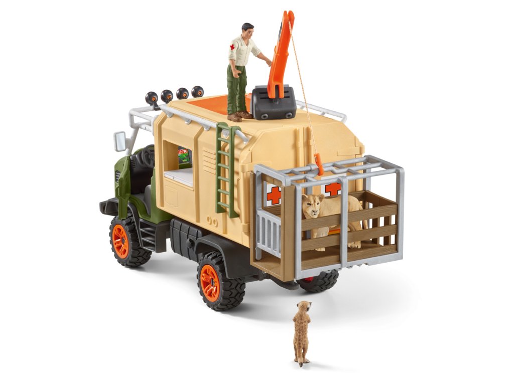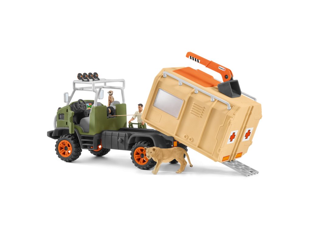 Ranger Tom a jeho kamarád surikata Ted jsou v záchranném voze ze Schleich® Wild Life na své první společné misi. Na Safari najdou Tom a Ted lvici, která musí být urgentně ošetřena v autě. Tom a Ted tedy spustí ošetřovací kabinu auta na zem. Nyní lze začít s ošetřením, jelikož auto je na to perfektně vybaveno: Obvazy a stetoskop má ranger Tom stále při roce. Po ošetření bude lvice přeložena do transportního boxu. Jeřáb nejdříve vytáhne kabinu zpět nahoru a následně lze na auto připevnit transportní box. Tom a Ted vypustí lvici u velkého vodního zdroje. Tam se zotaví! Lanový naviják jeřábu lze upevnit na kabinu nákladního vozu. Obsahuje: 1x lev, 1x surikata, 1x ranger, 1x jeřáb s lanovým navijákem, 1x klec, 1x nákladní auto, 1x žebřík, 1x kontejner, 1x stetoskop, 1x obvaz. Rozměr balení: 39 x 23 x 11 cm. Nevhodné pro děti do 3 let. Doporučený věk: 3-8. Video: https://www.youtube.com/watch?v=uD-quaVa1u8