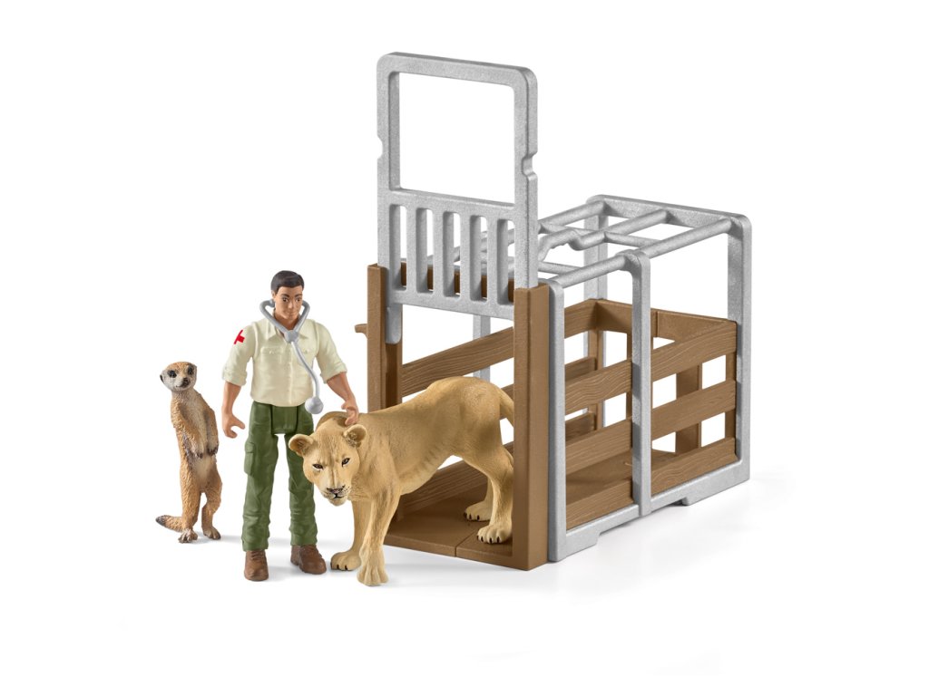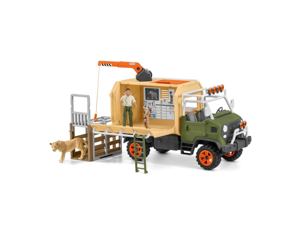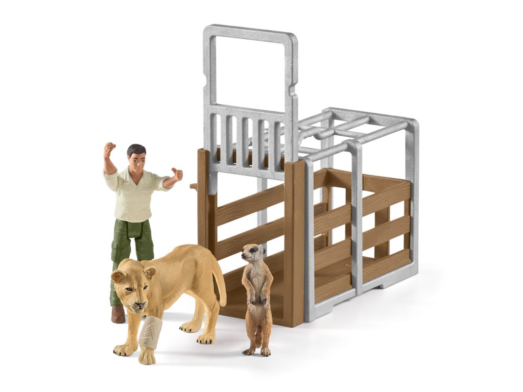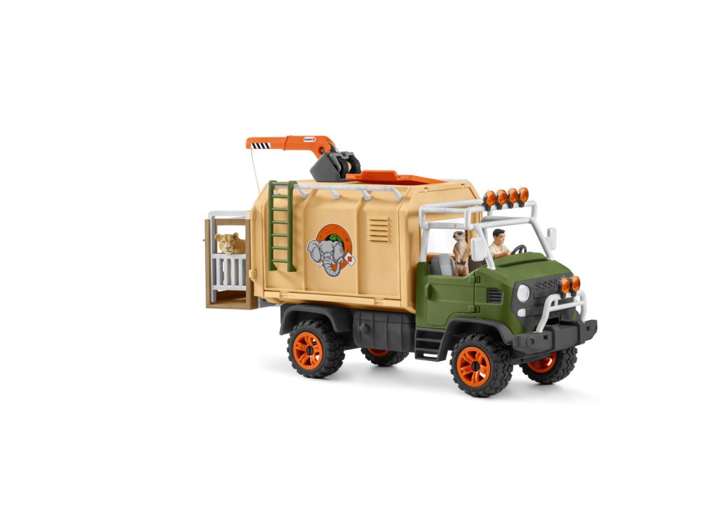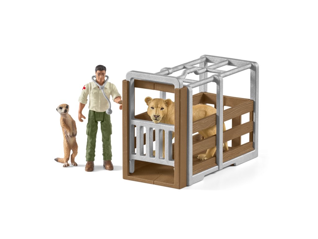 Ranger Tom a jeho kamarád surikata Ted jsou v záchranném voze ze Schleich® Wild Life na své první společné misi. Na Safari najdou Tom a Ted lvici, která musí být urgentně ošetřena v autě. Tom a Ted tedy spustí ošetřovací kabinu auta na zem. Nyní lze začít s ošetřením, jelikož auto je na to perfektně vybaveno: Obvazy a stetoskop má ranger Tom stále při roce. Po ošetření bude lvice přeložena do transportního boxu. Jeřáb nejdříve vytáhne kabinu zpět nahoru a následně lze na auto připevnit transportní box. Tom a Ted vypustí lvici u velkého vodního zdroje. Tam se zotaví! Lanový naviják jeřábu lze upevnit na kabinu nákladního vozu. Obsahuje: 1x lev, 1x surikata, 1x ranger, 1x jeřáb s lanovým navijákem, 1x klec, 1x nákladní auto, 1x žebřík, 1x kontejner, 1x stetoskop, 1x obvaz. Rozměr balení: 39 x 23 x 11 cm. Nevhodné pro děti do 3 let. Doporučený věk: 3-8. Video: https://www.youtube.com/watch?v=uD-quaVa1u8