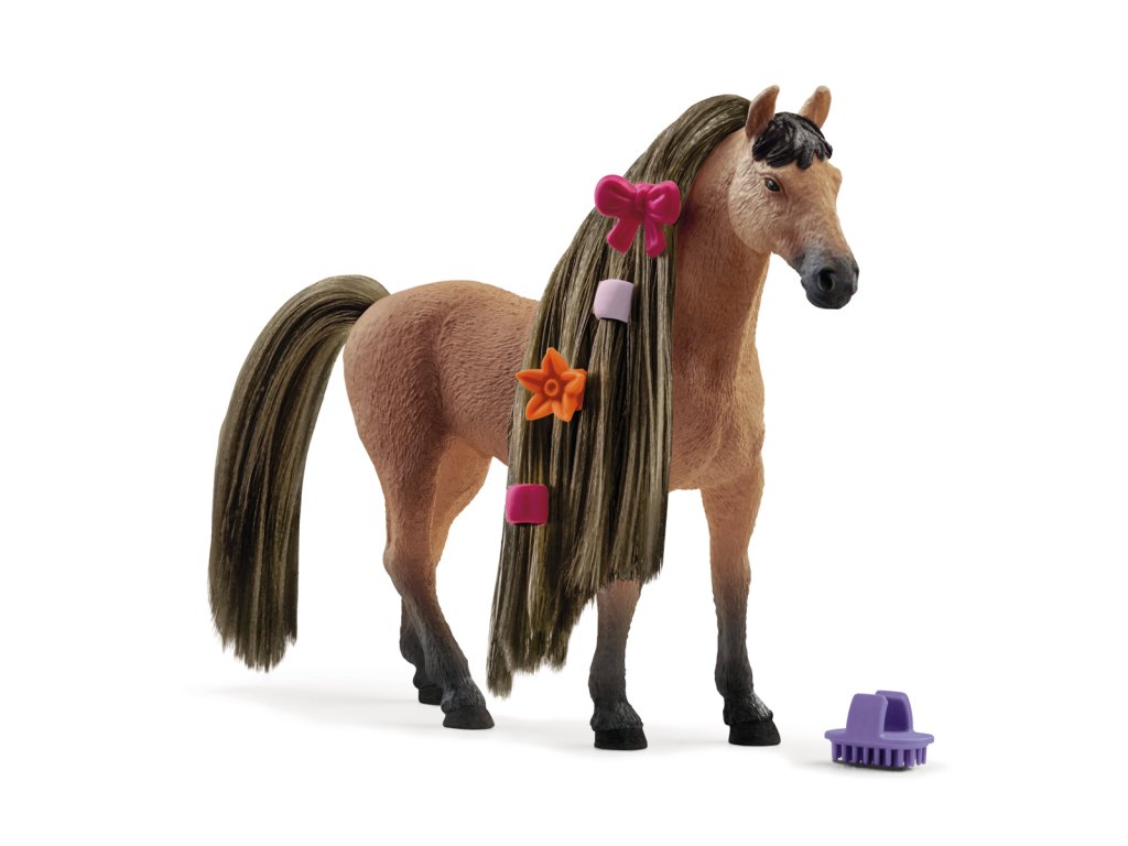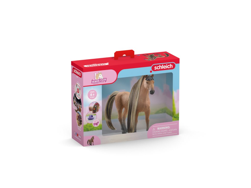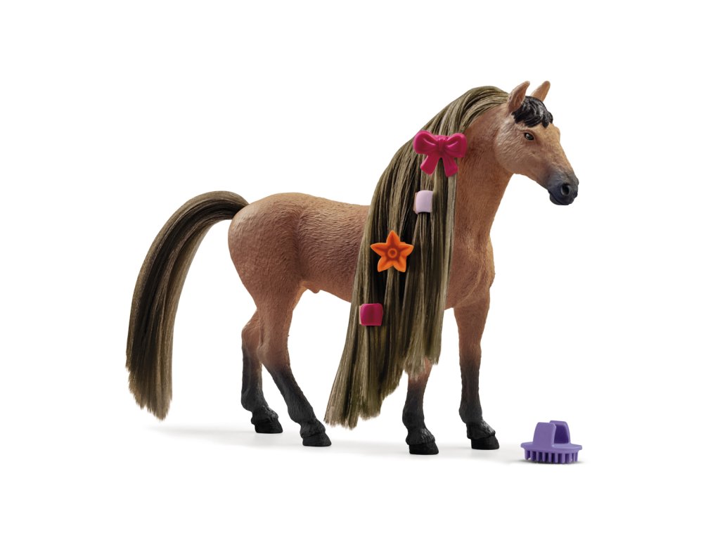 Nádherný výstavní achaltekinský hřebec má typickou pískově zbarvenou srst připomínající jeho pouštní domov. Ohledně hřebelcování ale tak vybíravý vždycky nebyl. Teď, když je s tebou, se můžeš naplno věnovat jeho krásné dlouhé hřívě! Pokud mu ji předem pečlivě rozčešeš, můžeš mu z ní zaplést úžasné účesy. Doplňky do hřívy máš připravené, tak je stačí jen zakomponovat do finálního účesu. Rozměry: 19x15x6cm. Vhodné pro děti od 3 let.