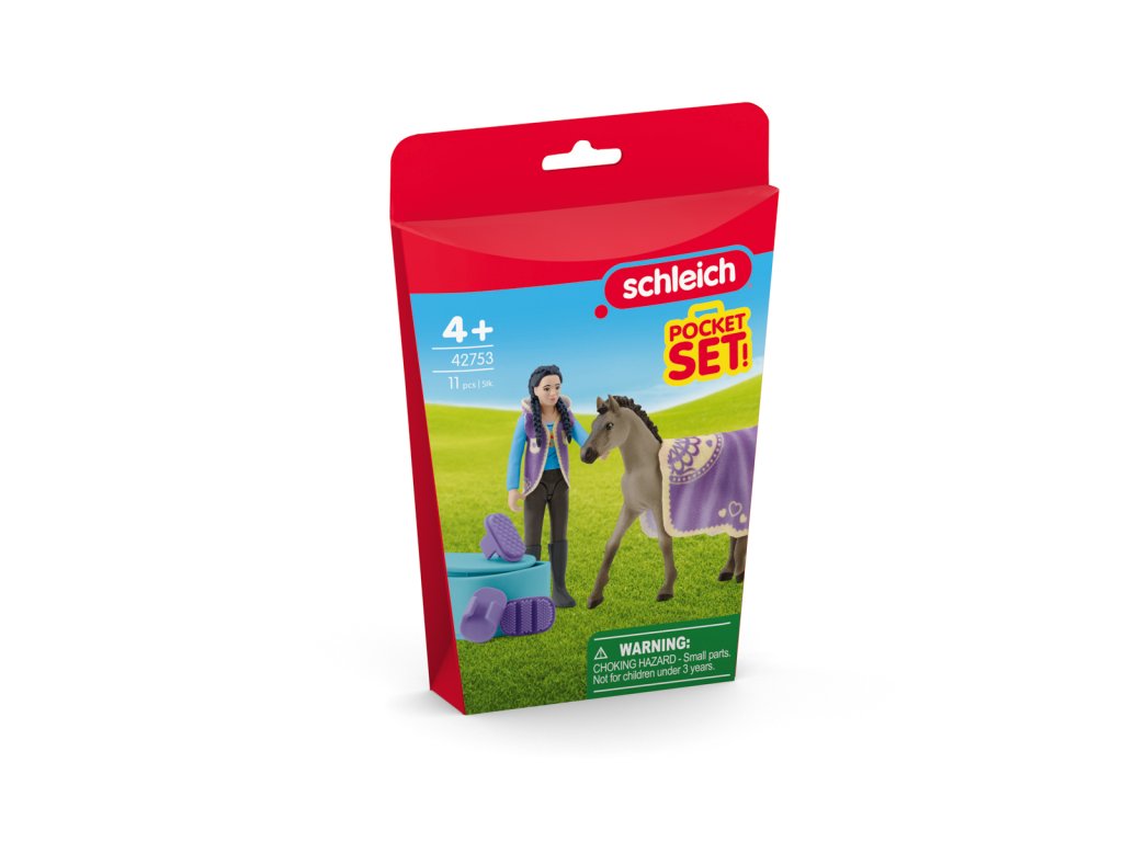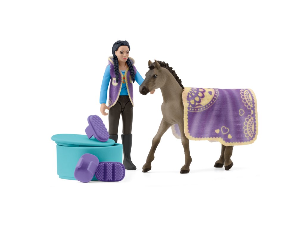 Páni, to vypadá skvěle! Kim upravila hříběti Criollo Definitivo srst kartáčem a hřebenem. Sada Beauty Set s Kim obsahuje všechno, co potřebuješ pro opravdový koňský wellness den. Kim nejdřív malé hříbě Criollo Definitivo vykartáčuje a potom mu kartáčem vyčeše srst. Podívej, jak se mu srst leskne! Malé hříbě si to moc užívá a ochotně drží. Nakonec mu přes hřbet položí krásnou koňskou deku. Dokonale ladí s její vestou. Vypadá to skvěle! Deka pro koně je odnímatelná. Figurka Kim je plně pohyblivá. Obsah: 1× figurka Kim, 1× hříbě Criollo Definitivo, 1× deka pro koně, 1× vesta, 1× bedna, 1× houba, 1× hřeben, 1× prstový kartáč Curry Comb. Hrací sada mini figurek se dá použít samostatně nebo v kombinaci se stávajícími výrobky HORSE CLUB. Tahle hrací sada je součástí sady POCKET SET a je vhodná pro děti od 4 let. Rozměry balení: 19,9 x 10 x 5,8 cm.