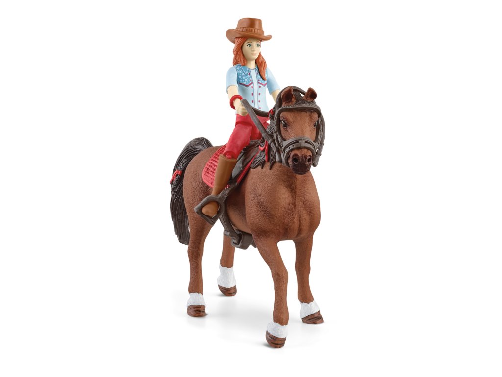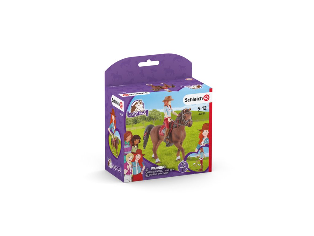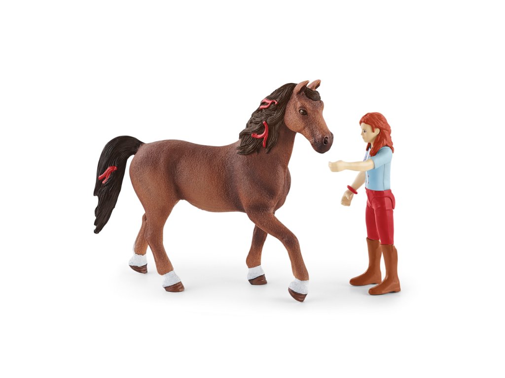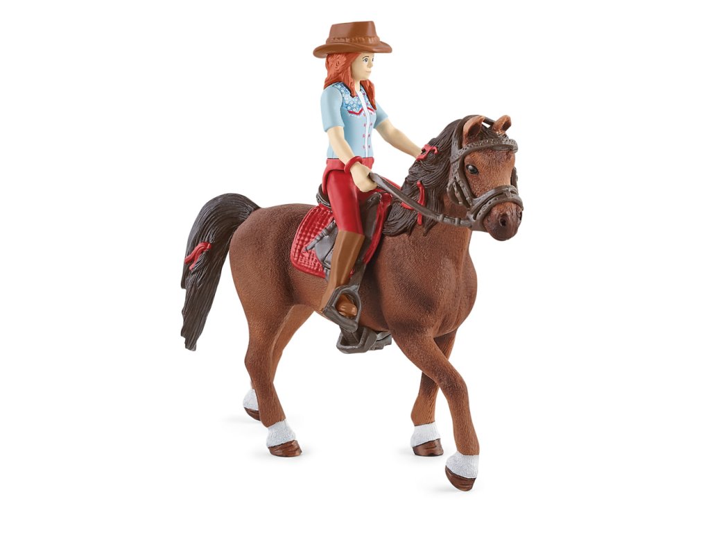 Zrzka Hannah & Cayenne ze Schleich® Horse Club jsou neporazitelný tým. Do každého dobrodružství jdou společně! Plně pohyblivá figurka Hannah může nejen stát, ale umí pokrčit nohy tak, aby mohla sedět na svém valachovi Cayenne. Westernové ježdění je pro Hannah vášeň. Před každou jízdou si svého valacha sama osedlá. Rudý náramek, který má na ruce je známkou hlubokého přátelství mezi kamarádkami z Horse Clubu. Sada obsahuje: 1x figurka Hannah (s pohyblivými klouby), 1x valach, 1x jezdecká přilba, 1x westernové sedlo, 1x uzda s otěží, 1x náramek na ruku. Figurky Schleich jsou mimořádně detailní, láskyplně malované a umožňují dětem hrát si a zároveň se učit. Nevhodné pro děti do 3 let. Rozměr balení: 15 x 18 x 8,2 cm. Doporučený věk: 5-12.