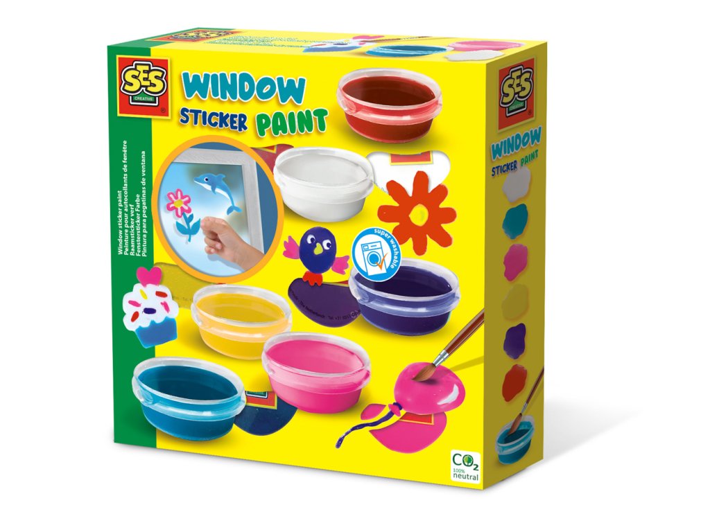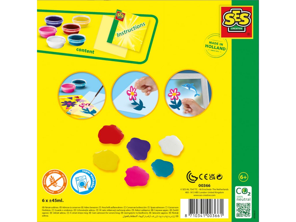 Sada slupovacích barev na sklo. Vytvořený obrázek můžete po zaschnutí přenést a umístit na okno, zrcadlo, sklenici, dlaždici nebo jiné hladké podklady. Sada obsahuje: 6 veselých barviček, štětec. Barvy lze vyprat. Věk: 6+