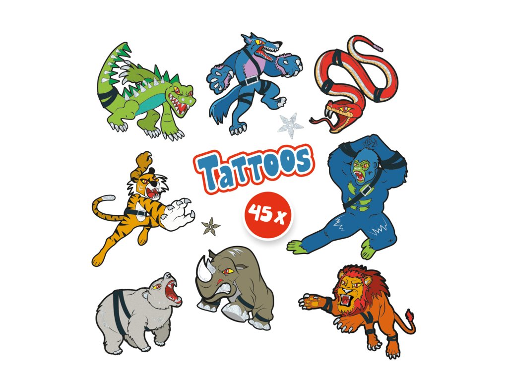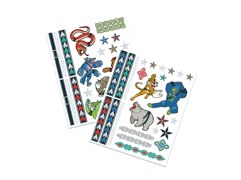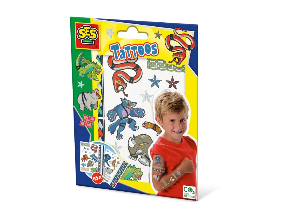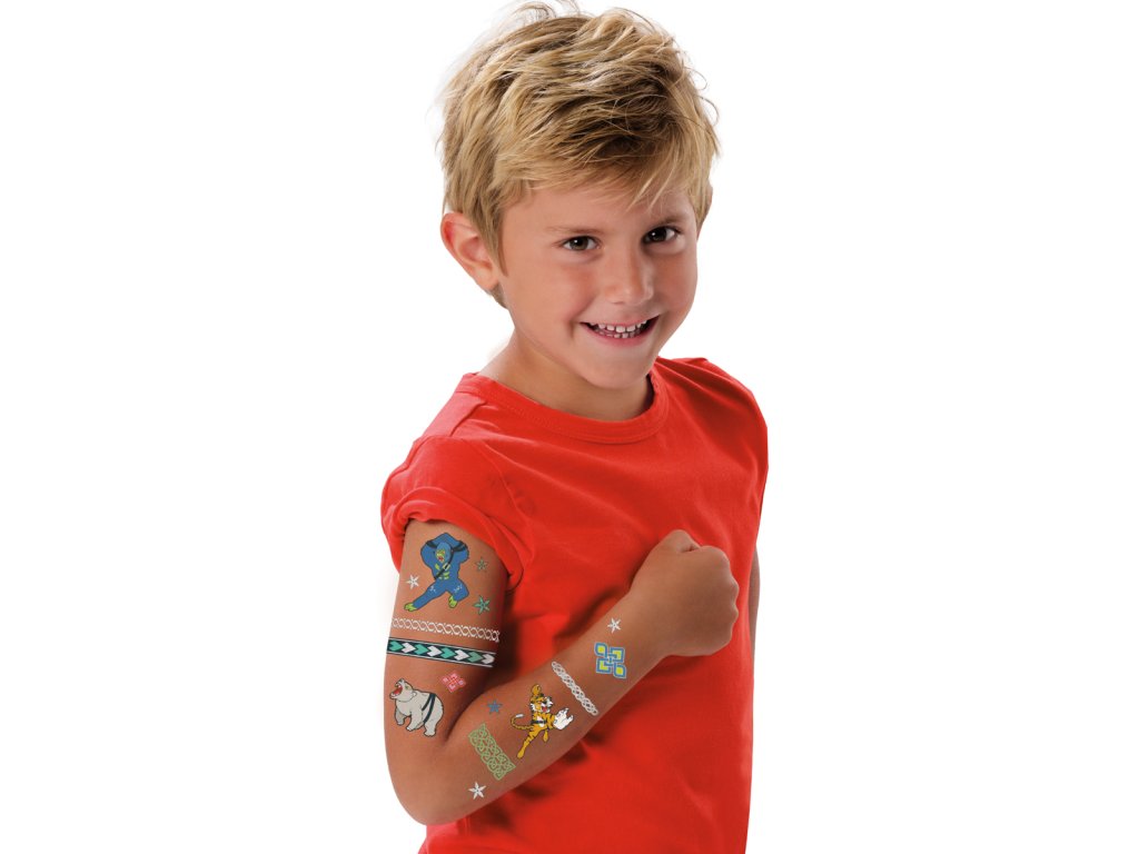 Tato tetování s metalickým efektem jsou teda cool! Sada obsahuje 45 dočasných tetování zvířecích válečníků, tribalů, hvězd a mnoho dalších vzorů. Tetování se snadno aplikuje, je kosmeticky testováno a také se dá snadno smýt z pokožky. Rozměr: 15x20x0,5cm. Věk: 3+
