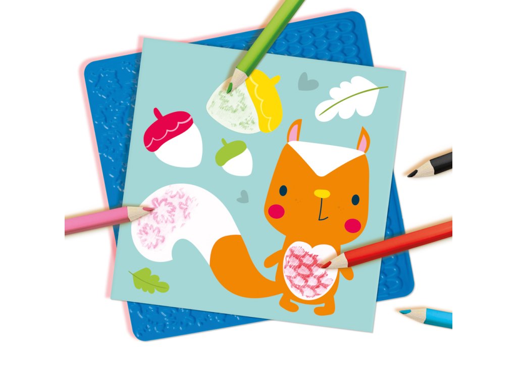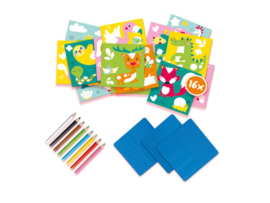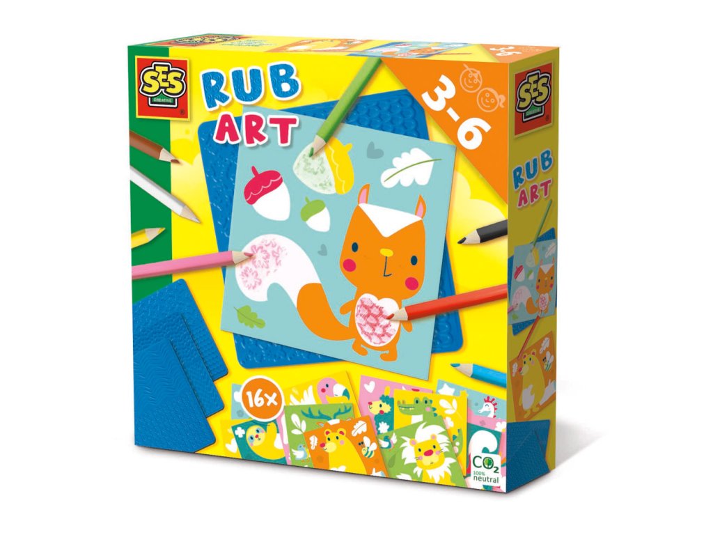 Tato umělecká sada SES obsahuje 16 barevných listů, které lze vybarvit pomocí zábavných plastových destiček s vyvýšenými vzory. Na jednu ze tří destiček položte barevný papír a jemnými tahy přetřete pastelkou. Jaké vzory vidíte? Sada obsahuje: 16 barevných listů, 3 plastové podložky s různou strukturou, 8 barevných pastelek. Rozměr balení: 20 x 20 x 4 cm. Věk: 3+