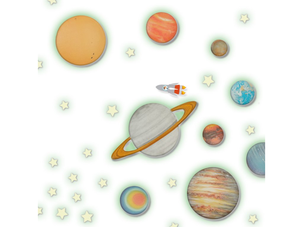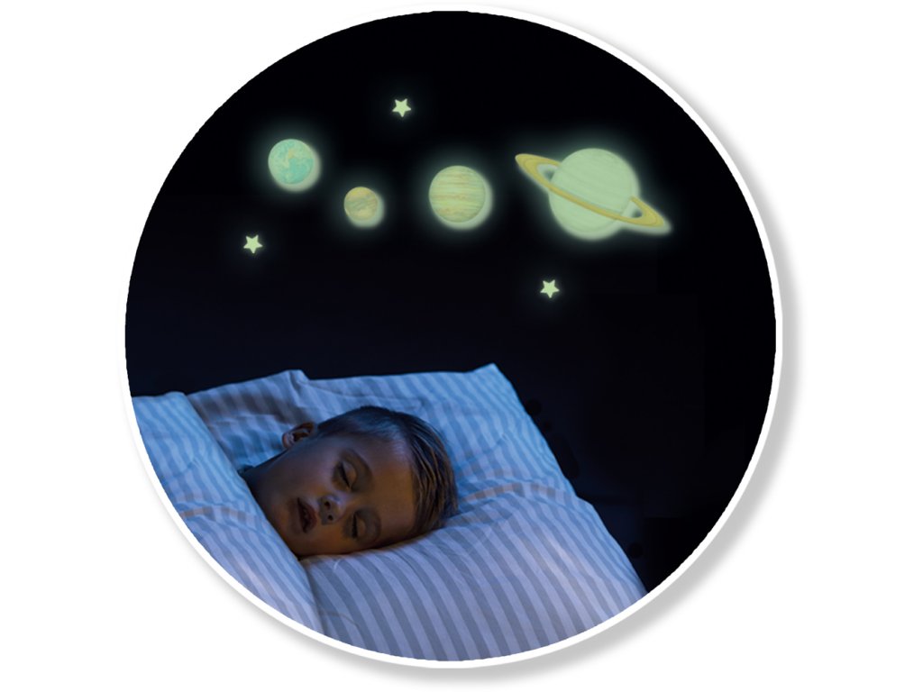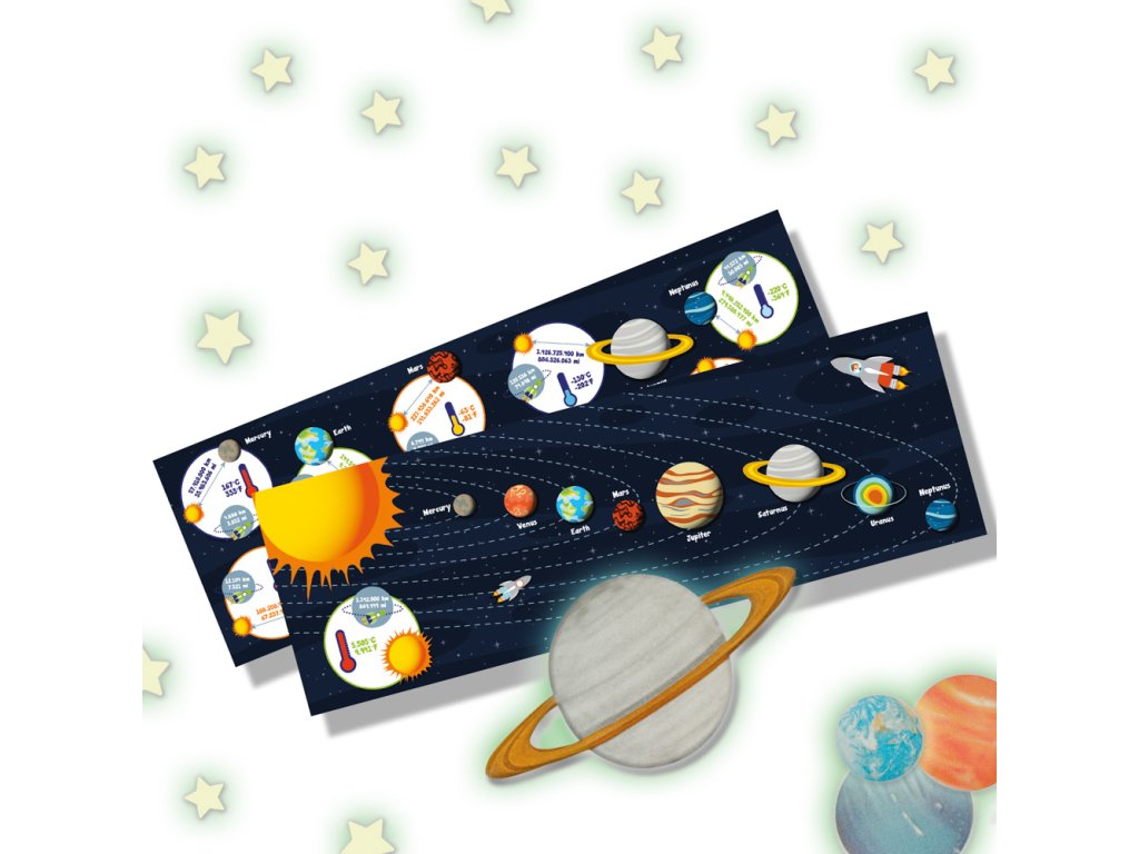Milujete vesmír? Zajímáte se o hvězdy a planety naší sluneční soustavy? Tato sada je přesně pro vás. Proměňte svou ložnici v krásnou sluneční soustavu. Nejen, že to vypadá opravdu skvěle, je to také velmi naučné. Objevte všechny různé planety! 9 nálepek planet a hvězd lze snadno připevnit na zeď nebo strop. Díky speciálnímu efektu záře ve tmě bude vaše ložnice v noci zářit! Obsahuje: 9 planet, 46 samolepících hvězd, pokyny s informacemi o planetách. Věk: 5+