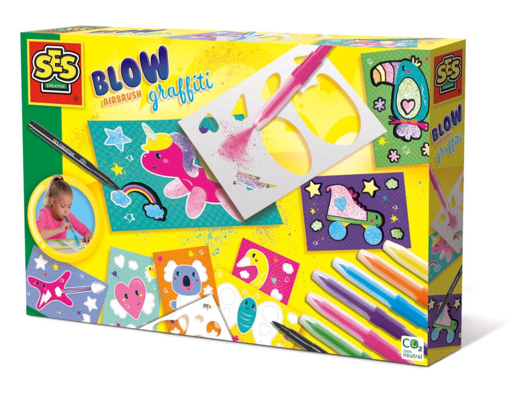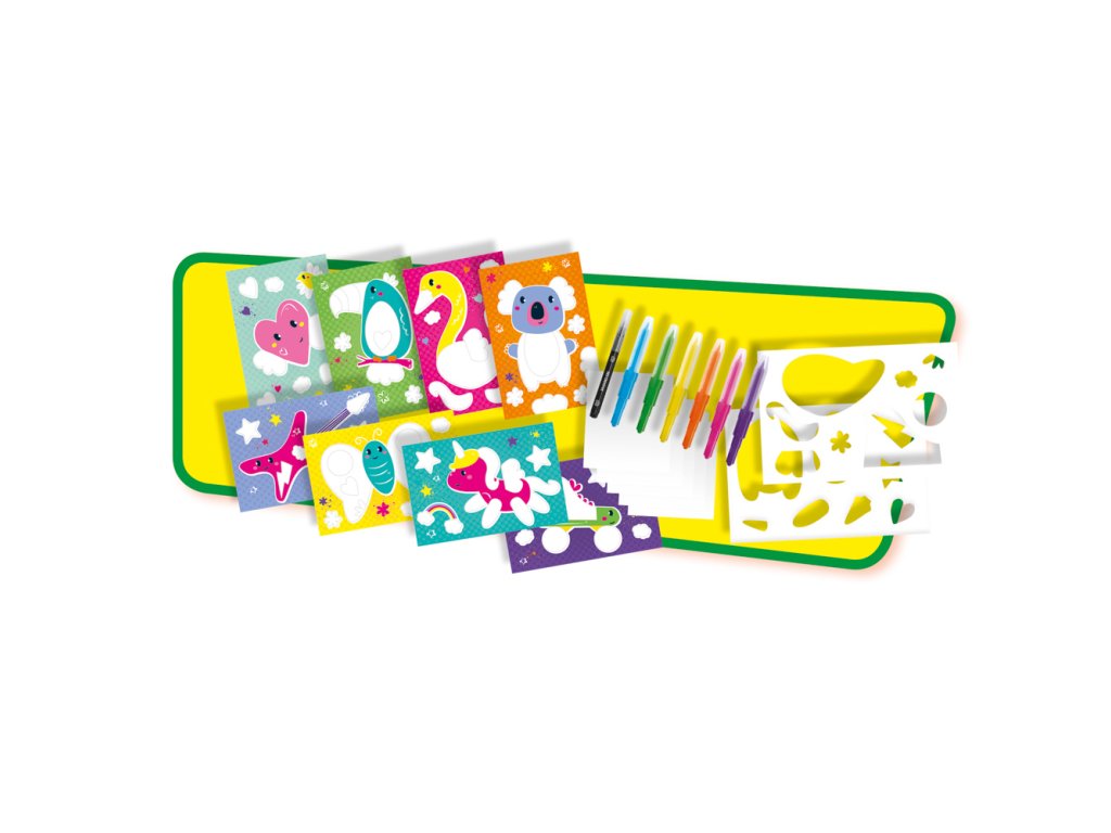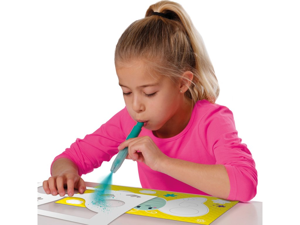 Dozdobte předtištěné karty pomocí foukacích fix. Přiložené šablony vám pomohou úhledně vybarvit obrázky. Poté můžete své výtvory obtáhnout černým fixem. Sada obsahuje: 6 barevných foukacích fix, černý fix, 8 předtištěných karet, 5 čistých papírů, 2 šablony s tvary. Rozměr balení: 30 x 20 x 4 cm. Věk: 6+