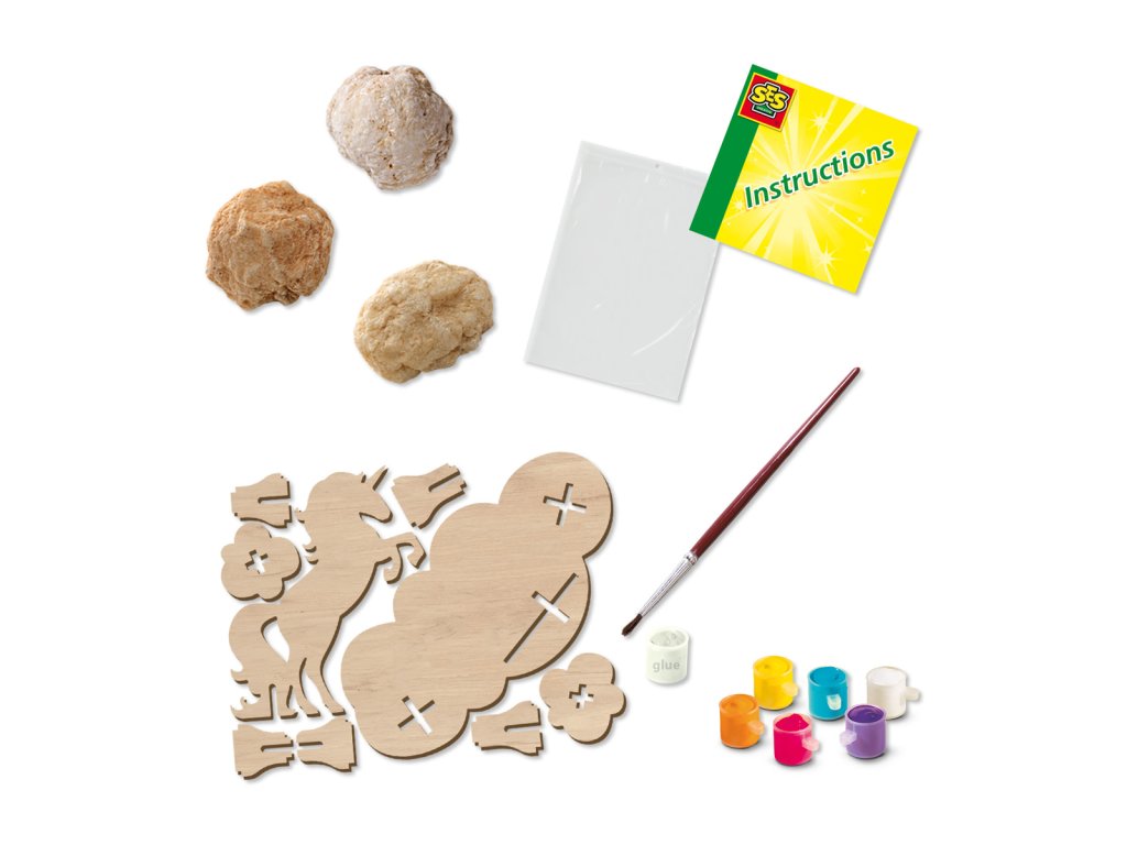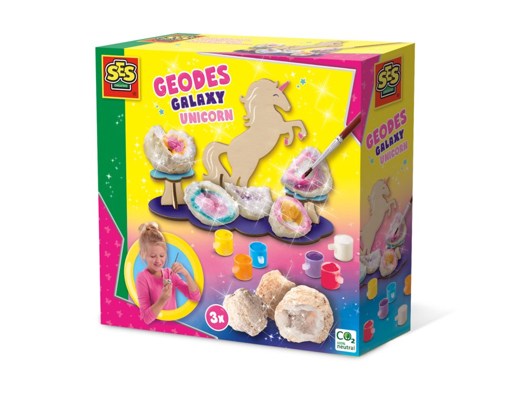 Objevte geody! S touto sadou od SES Creative mohou děti objevit skutečné krystaly a vystavit je na dřevěném stojanu pro jednorožce. Kladivem rozbijte geody a začněte je zdobit. Pomocí šesti barev barvy mohou děti zdobit geody různými zábavnými barvami. Tyto nádherné krystaly budou vypadat ještě úžasněji! Natřete stojan a dejte těm nejlepším krystalům prominentní místo na podstavci. Balení: 20x20x6cm. Věk: 8+