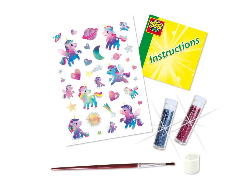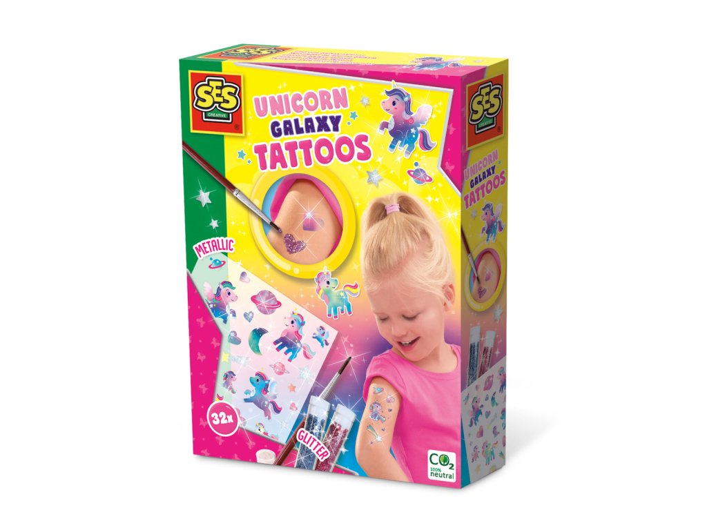 S těmito tetováními galaxy jednorožci můžete nejen ozdobit své ruce a nohy, ale můžete také použít lepidlo šetrné k pokožce a kosmetické třpytky, které tetování dodají další jiskru! Rozměry balení: 15x20x4cm. Věk: 5+
