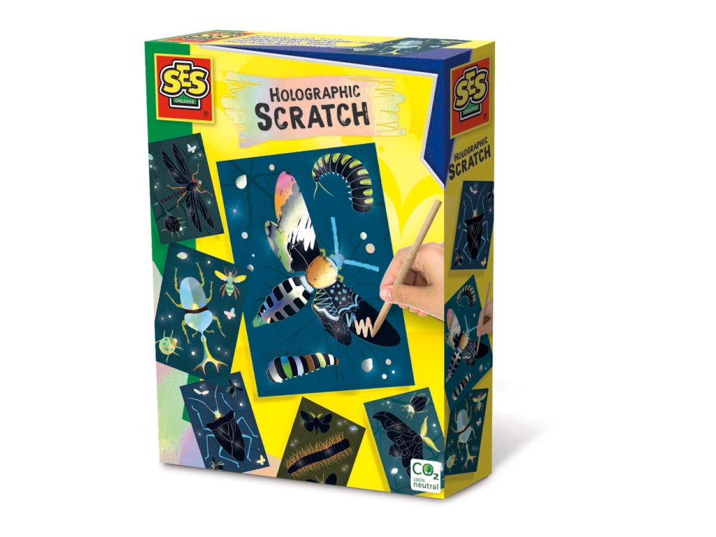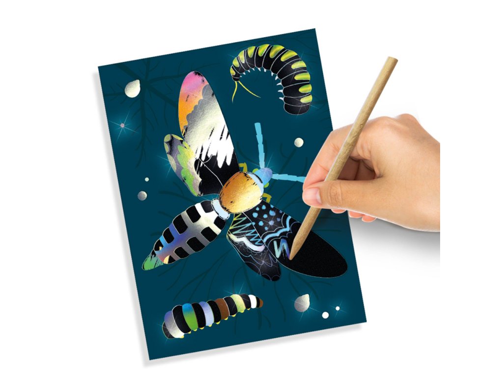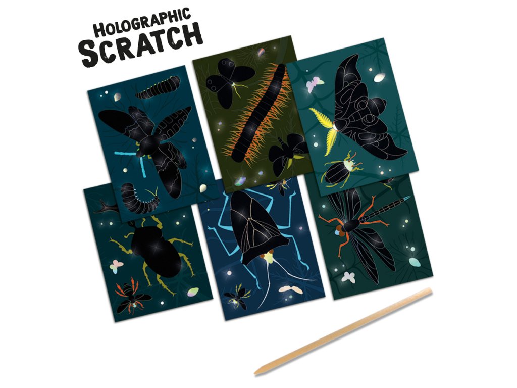 Páni, tyto vyškrabávací obrázky jsou velmi speciální. Úžasný hmyz má pod tmavou vrstvou holografický barevný efekt. Pomocí vyškrabávacího pera vymalujte krásné vzory a nechte je ještě více zářit. Sada obsahuje: 6 holografických vyškrabávacích karet, 1 dřevěné vyškrabávací pero. Rozměr balení: 15 x 20 x 4 cm. Věk: 3+