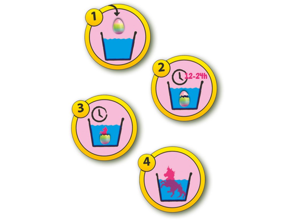 Co byste dělali, kdybyste našli vejce jednorožce? Zažijte to nyní! Umístěte vejce do nádoby s vodou a čekejte. Přibližně za jeden den se skořápka začne otevírat a do dvou dnů se úplně otevře a vy zjistíte, jak vypadá váš jednorožec. Sada obsahuje: 2 vejce s rostoucím jednorožcem. Věk: 5+