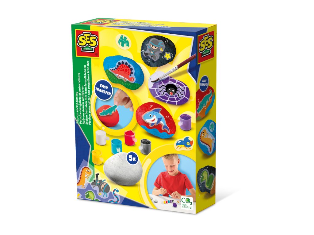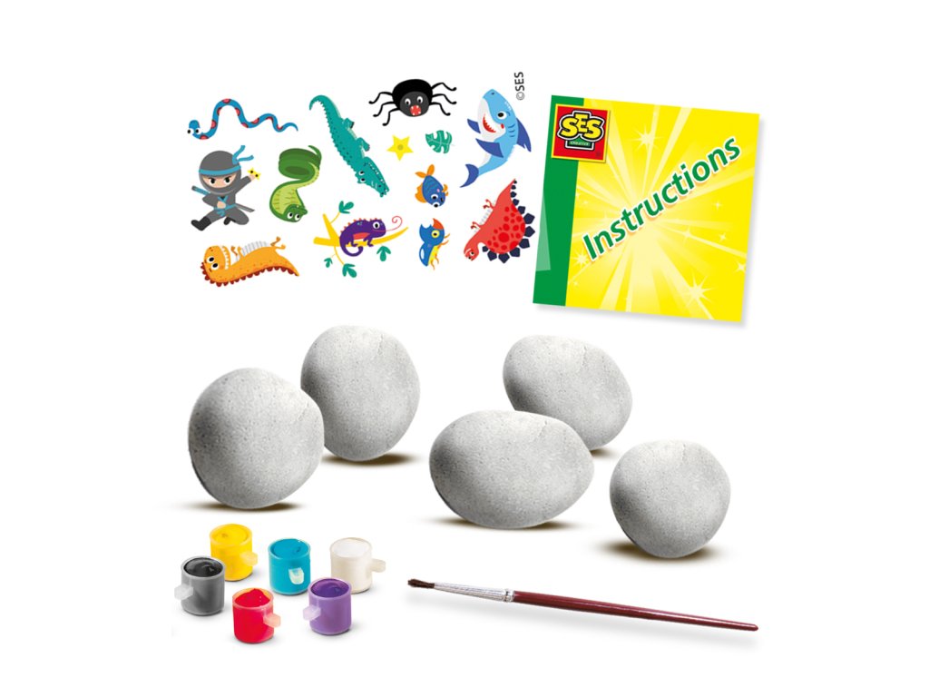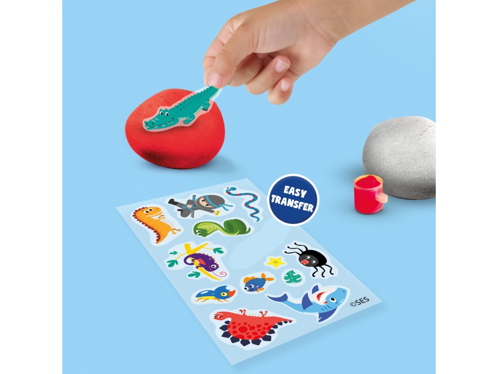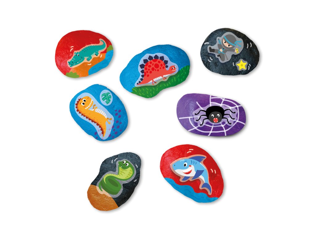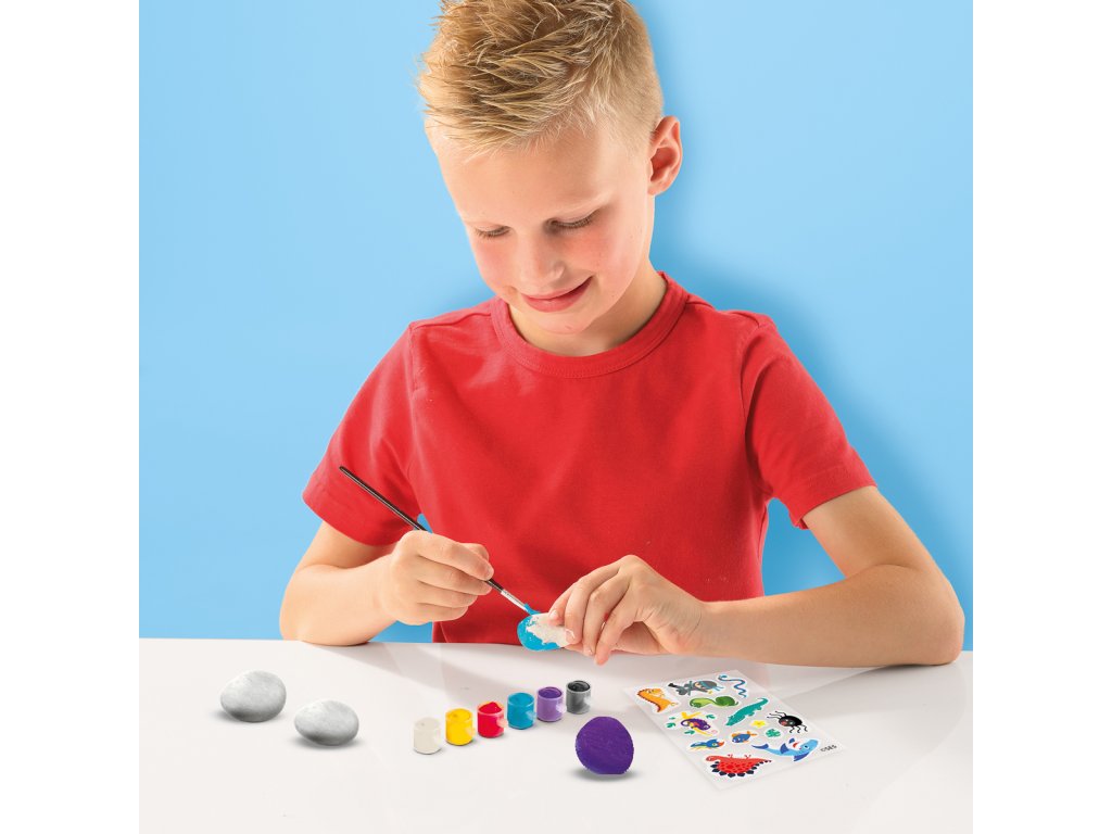 Malování kamínků s různými nálepkami! Namalujte si kamínky ve svých oblíbených barvách a polepte si je samolepkami například s pavouky, dinosaury, žraloky a jiné. Balení obsahuje 5 bílých kamenů, 6 barev a samolepky. Rozměr balení: 15x20x4cm. Věk: 5+