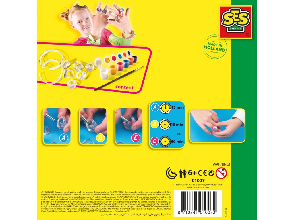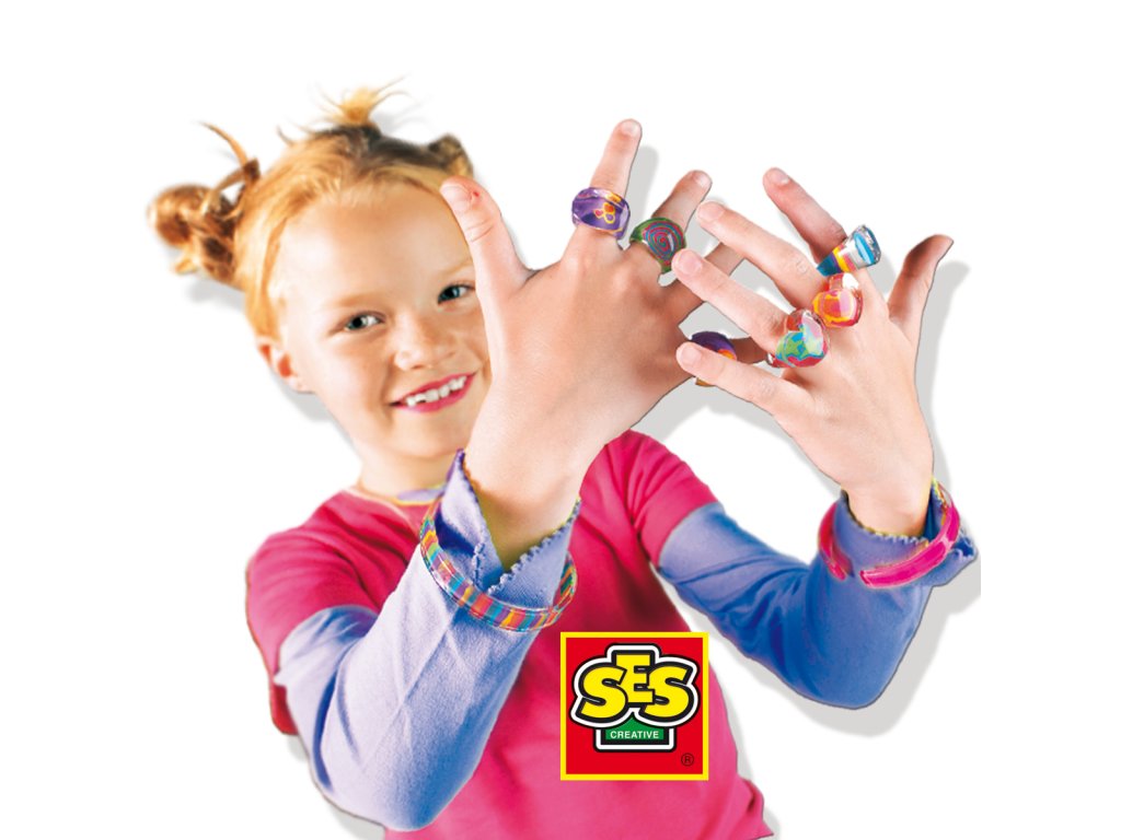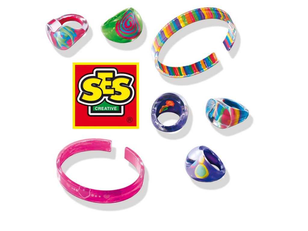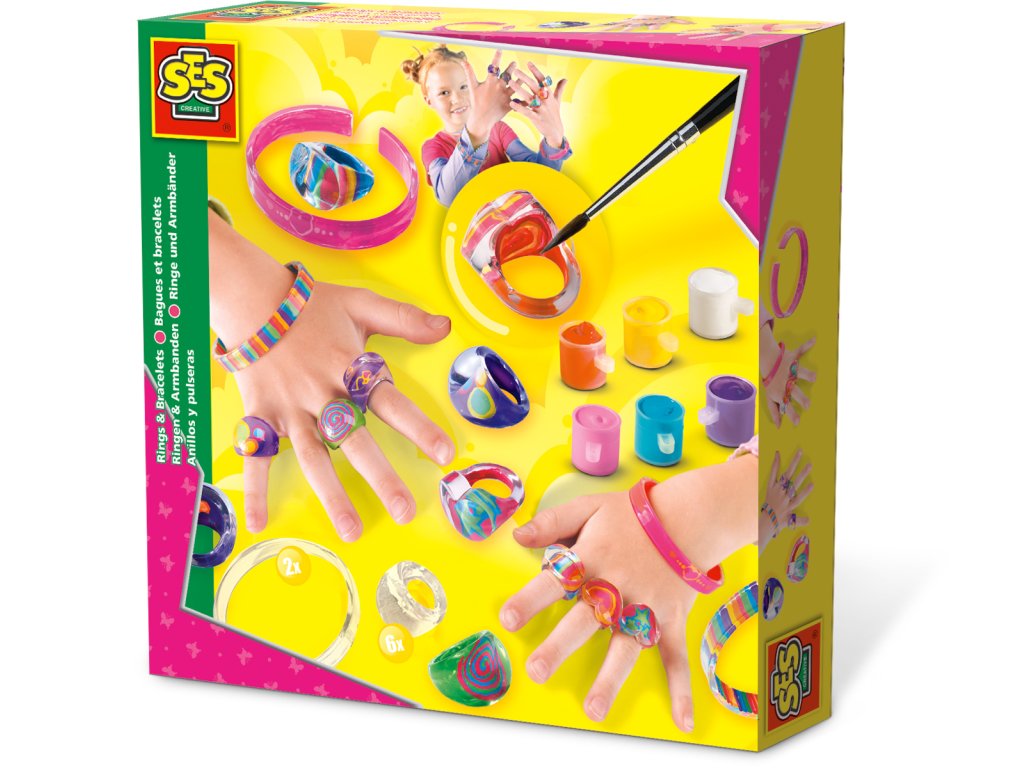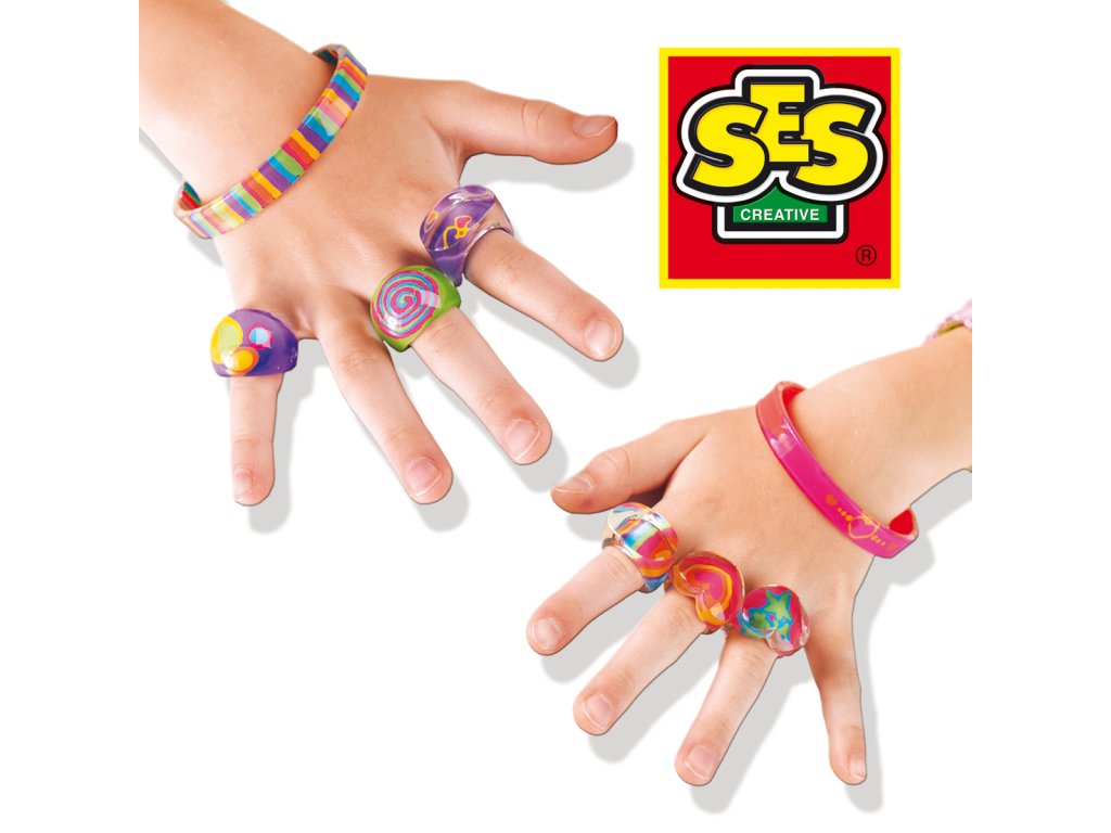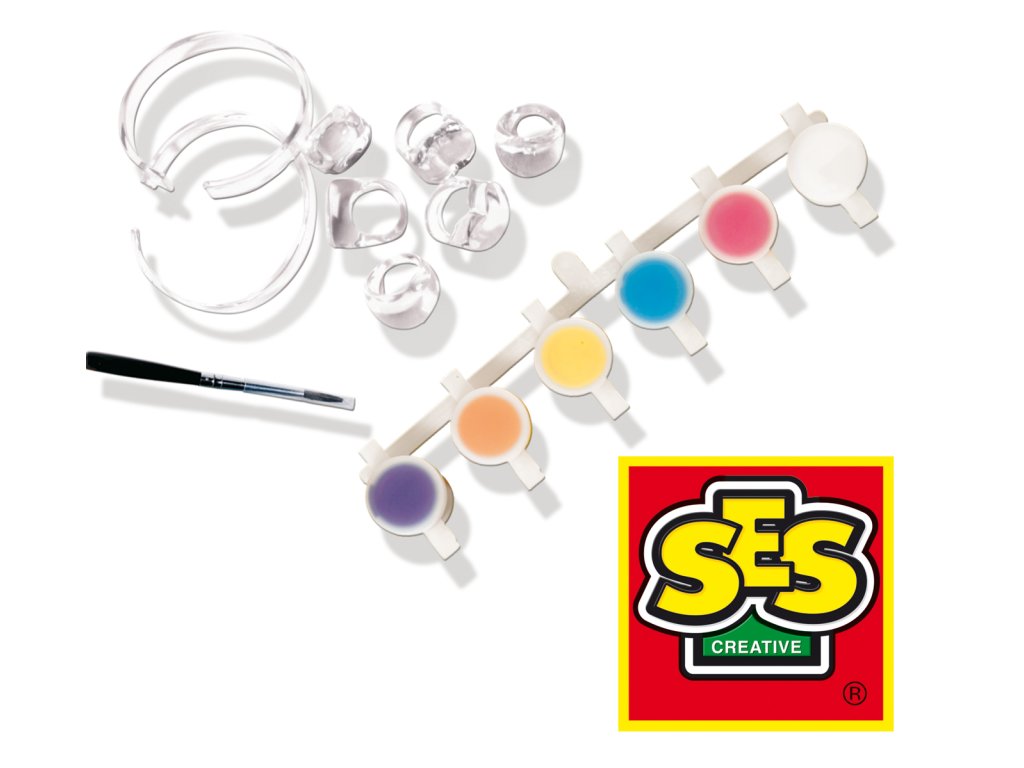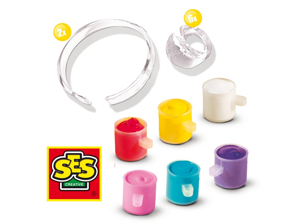 Prší venku nebo se chystáš na večírek s kámoškami? Buď kreativní a vyzkoušej si novu aktivitu! Vyrob si sama sadu jedinečných prstýnků a náramků! Jejich spodní stranu vymaluj přiloženými oděru-vzdornými barvami. Šperky tak získají nenapodobitelný vzhled. Balení obsahuje 6 velkých, módních prstýnků a 2 náramky z průhledné hmoty. Součástí balení je štětec a barvy. Baleno v dárkové taštičce. Věk: 6+