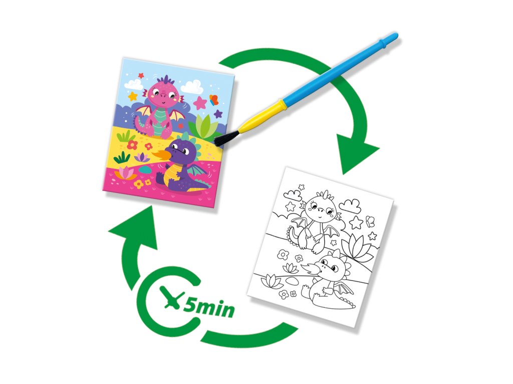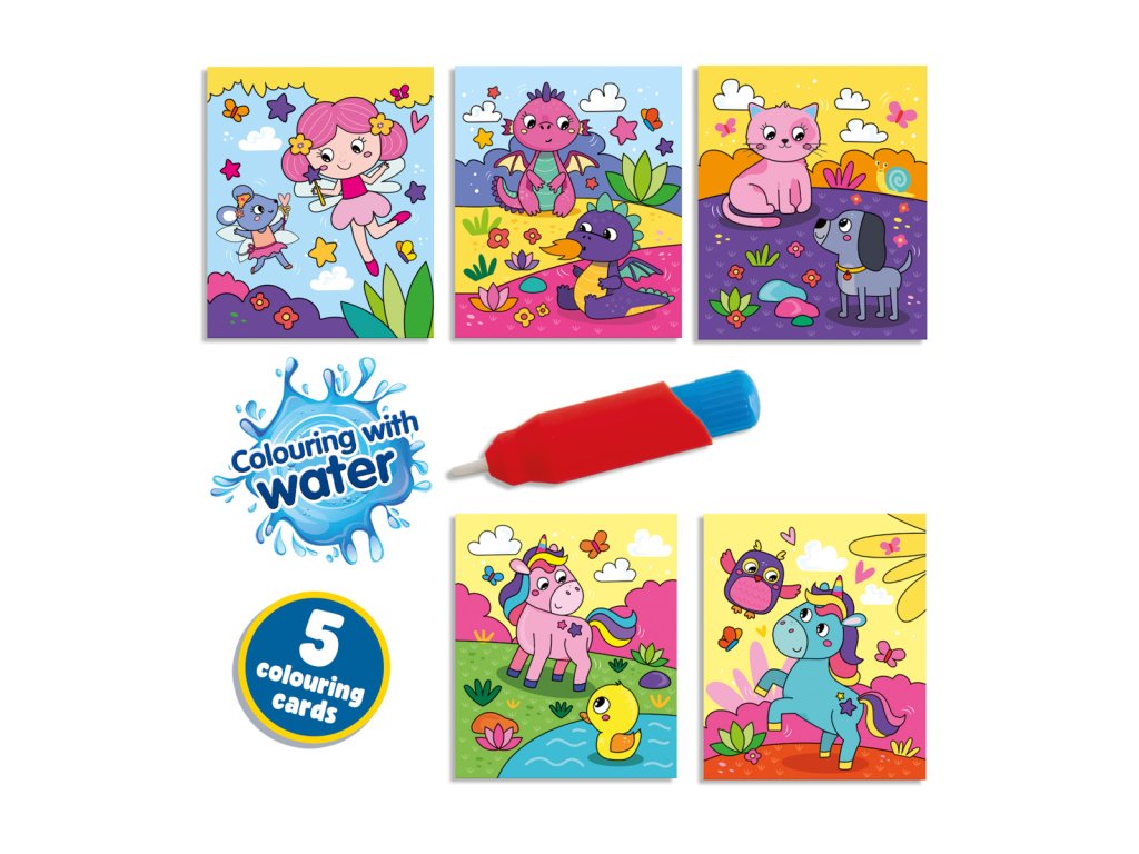 Objevte vodní omalovánky – Fantasy, ideální pro kreativní hru bez nepořádku. Jednoduše naplňte doplňovací vodní pero a sledujte, jak barevné scény ožívají. Tato kniha je ideální pro děti, aby si znovu a znovu užívaly kreativní činnosti. Znovu použitelné stránky vyschnou a vrátí se do původního stavu pro nekonečnou zábavu. Podporuje jemné motorické dovednosti a představivost – ideální pro malé průzkumníky. Sada obsahuje 5 stran omalovánek a doplňovací vodní štětec s jemnou špičkou. Rozměry balení: 25 x 15 x 2,5 cm. Věk: 3+