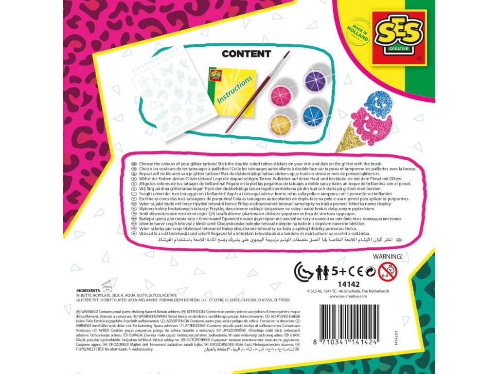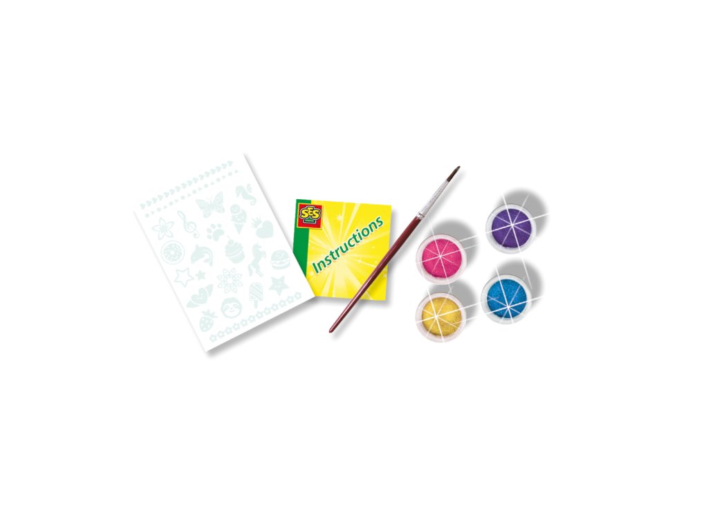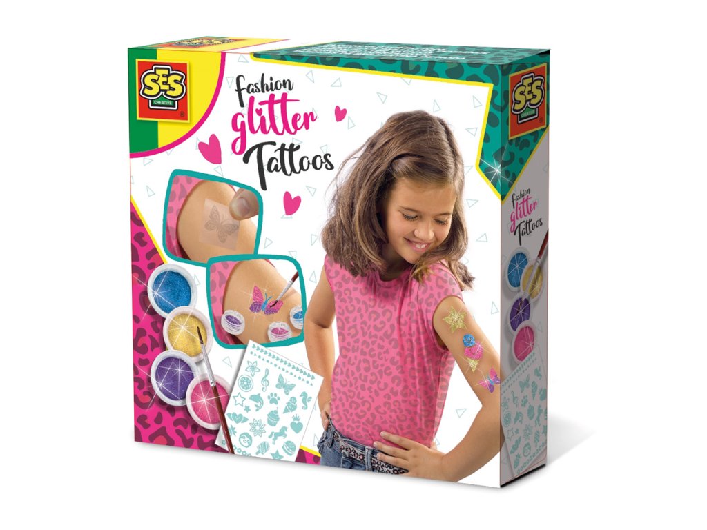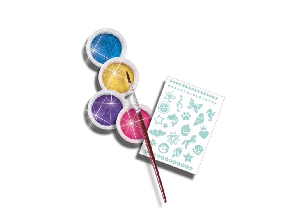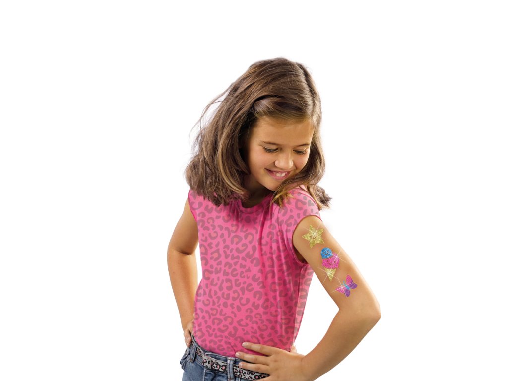 Vytvořte si vlastní módní tetování se třpytkami! Vyberte šablonu, přiložte na kůži, odstraňte ochrannou vrstvu, štětcem naneste třpytky a vaše originální tetování je hotovo. Pokud se vám již tetování nelíbí, jednoduše ho sloupejte a vytvořte si nové dílo. Tyto výrobky jsou bezpečné, kosmeticky testované, omyvatelné a vysoce kvalitní. Sada obsahuje: modré, zlaté, fialové a růžové třpytky, samolepící šablony, štětec, návod. Věk: 5+. Rozměr balení: 20 x 20 x 4 cm.