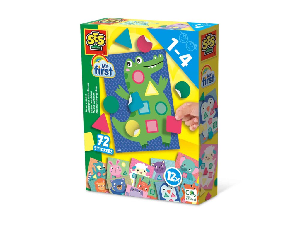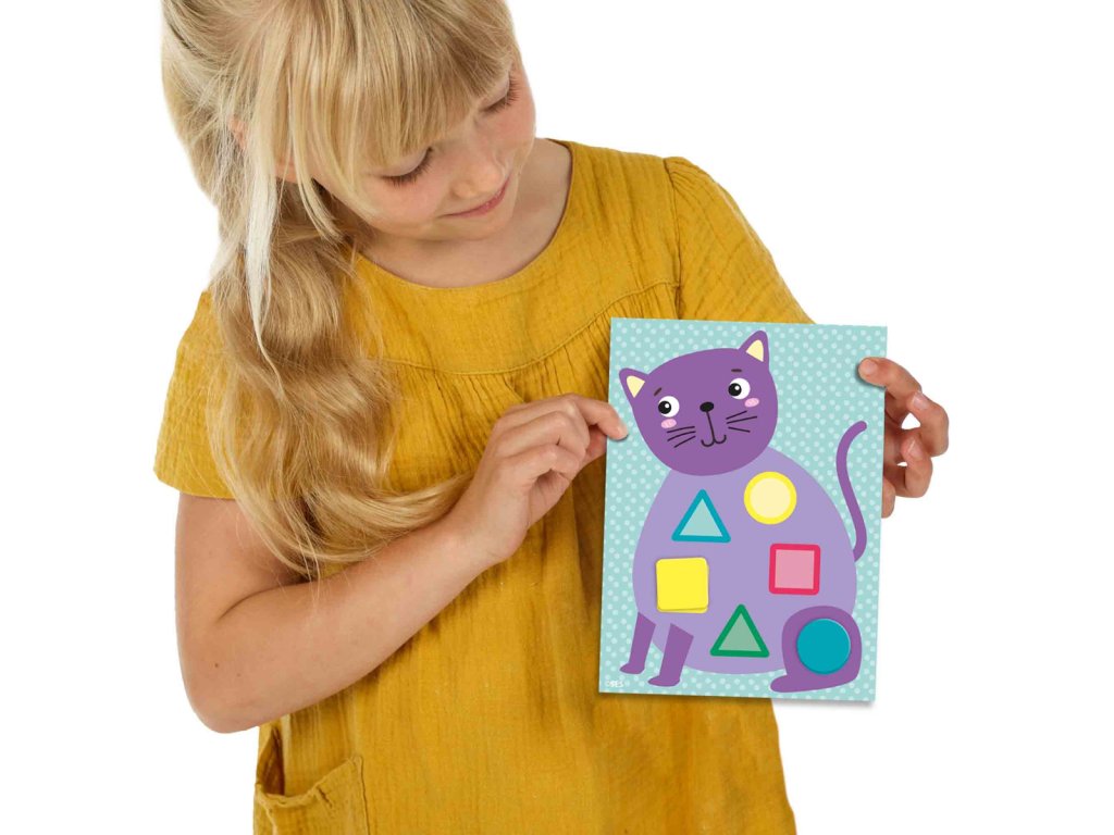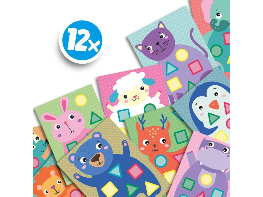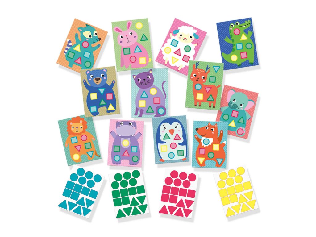 Moje první nalepování tvarů. Děti se naučí poznávat a spojovat různé tvary a barvy. 12 karet se zvířátky zobrazuje různé tvary v různých barvách a úkolem je nalepit všech 72 samolepek na zvířátka na kartičkách. Zábavná aktivita pro rodiče a jejich děti, kde si děti hravou formou procvičí koordinaci oko-ruka a jemnou motoriku. Rozměr balení: 15x20x4cm. Věk: 1+.