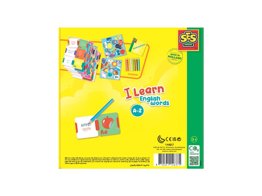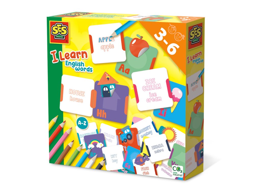 Chcete se naučit nějaká nová anglická slovíčka? Právě to můžete udělat s touto krásnou, ilustrovanou sadou I learn! Přiřaďte barevné nálepky ke správným prvním písmenům a poté najděte správné kartičky se slovy. Umístěte karty ve správném pořadí. Pokud jste uvedli správné slovo, barevné testovací oblasti se budou shodovat. Vybarvováním slov se aktivně učíte hláskovat slova a krok za krokem se učíte více a více anglických slov. Obsahuje: 52 karet s písmeny a anglickými slovy, 8 pastelek. Věk: 3+