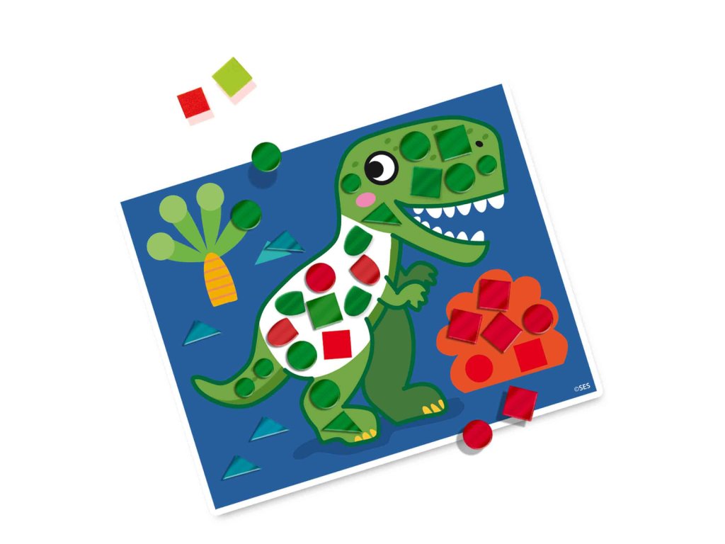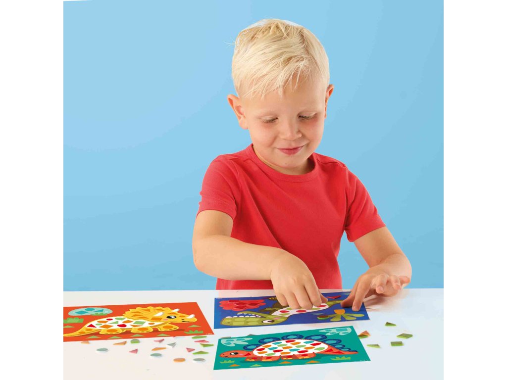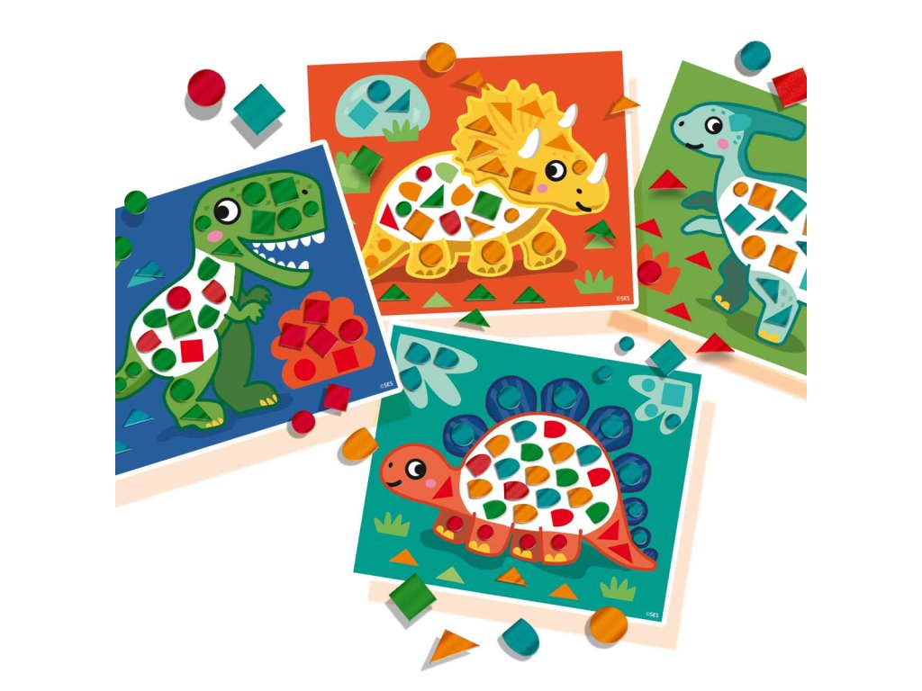 Dinosauři jsou oblíbení téměř u každého dítěte a všichni si s touto mozaikovou sadou budou rády hrát! 4 karty s obrázky dinosaurů lze polepit pěnovými samolepkami v různých tvarech mozaiky. Navíc mají metalický efekt! Tato sada stimuluje jemnou motoriku malých dětí, aniž by si to uvědomovaly! Rozměr balení: 30x20x4cm. Věk: 3+.