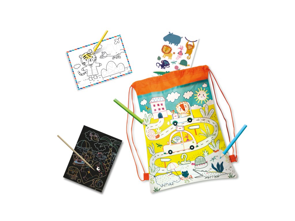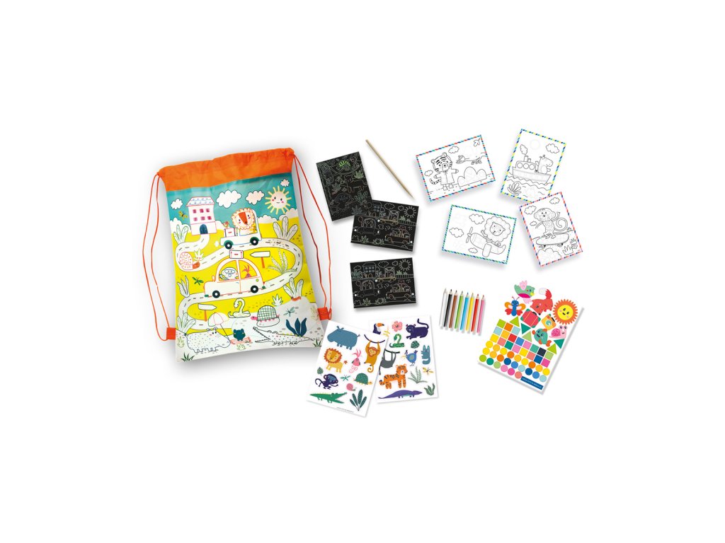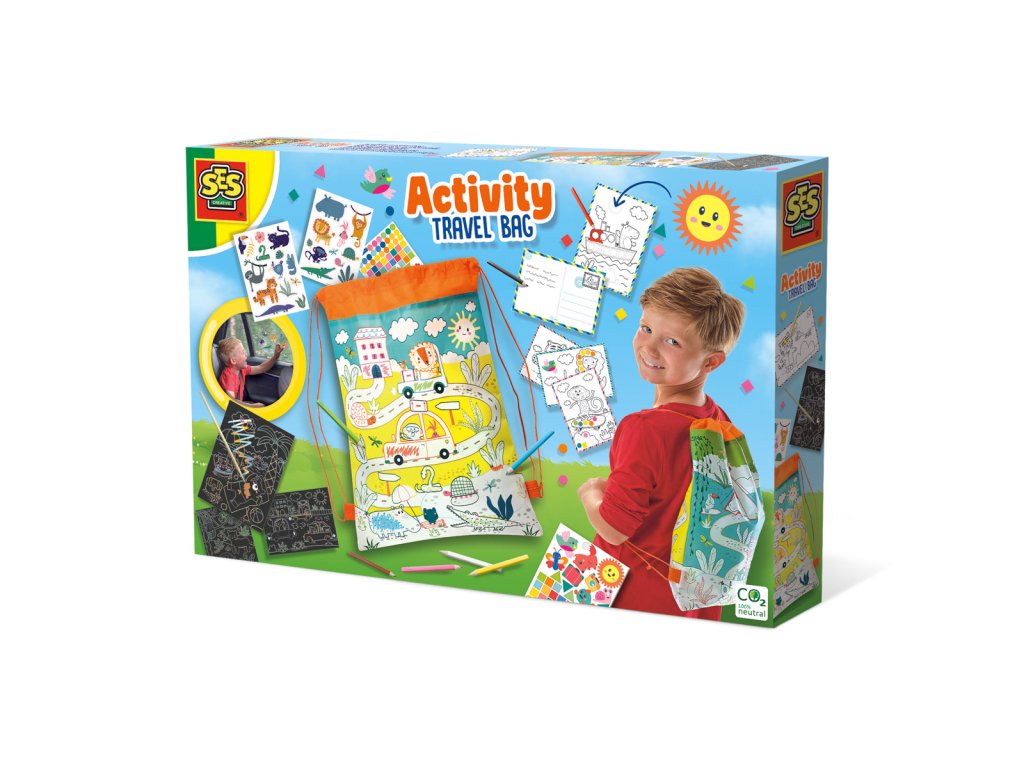 Cestovní taška od SES obsahuje mnoho různých částí a několik aktivit. Je to skvělé pro dny venku a prázdniny! Škrábací karty, archy samolepek pro vytváření mozaiek, pastelky, samolepky na okna a pohlednice, které lze vybarvit. Dokonce i taška je velký barevný list a může být ozdobena, jak se vám líbí! Je to snadné vzít s sebou, s dostatečným prostorem pro plyšové hračky a další zábavnu. Rozměry balení: 30x20x4cm. Věk: 3+
