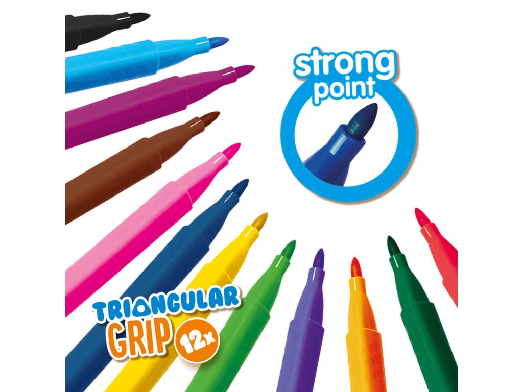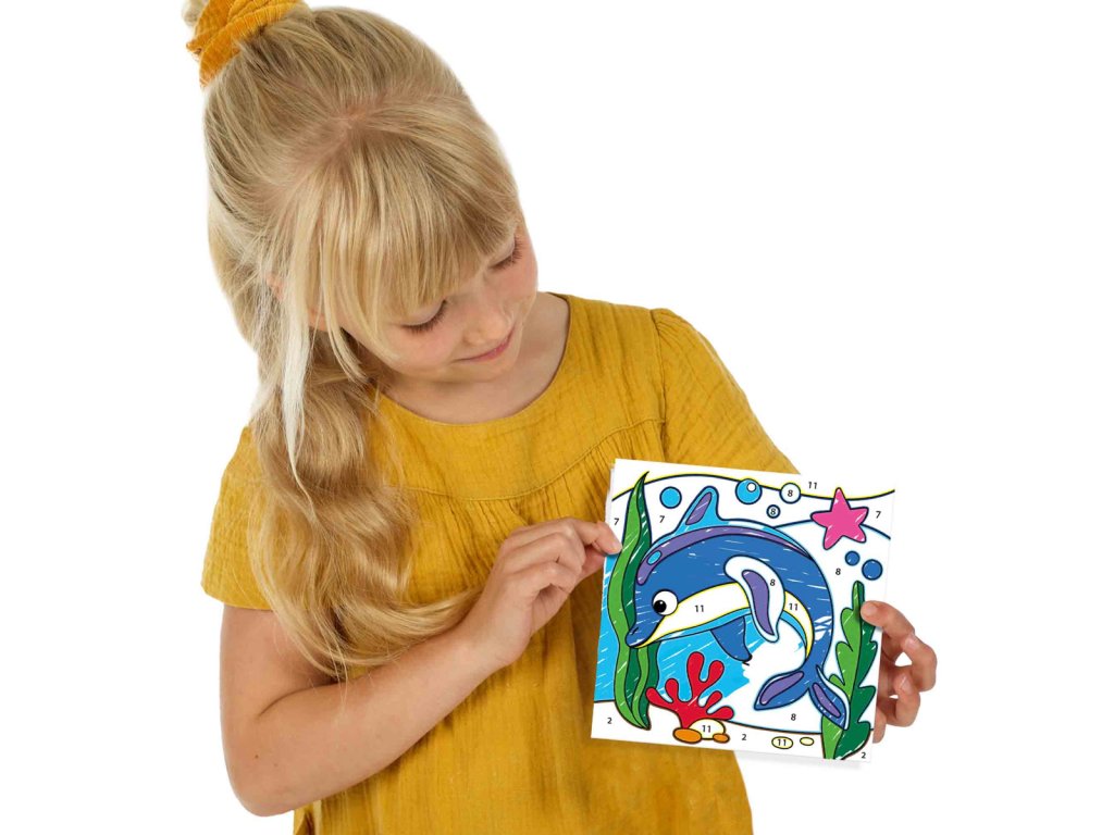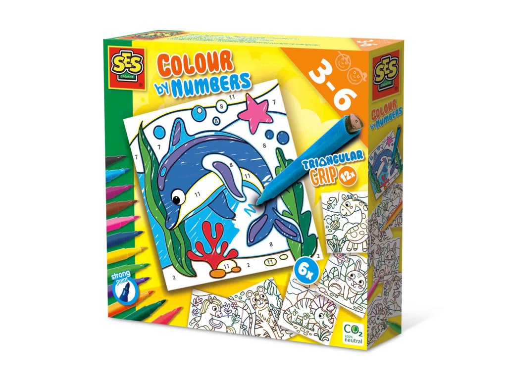 Vybarvování podle čísel pro malé děti od 3 let. 12 barevných popisovačů s pevným hrotem podporují dobrý úchop díky trojúhelníkovému tvaru jednotlivé fixy. Nejmladším dětem, které ještě neumějí dobře počítat, navíc s vybarvováním pomáhají barevná ohraničení obrázků. Balení obsahuje 6 obrázků a 12 fixů. Roměr balení: 20x20x4cm. Věk: 3+.
