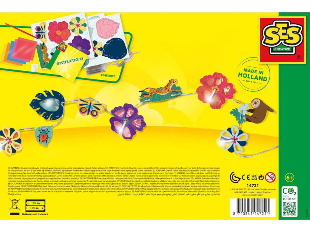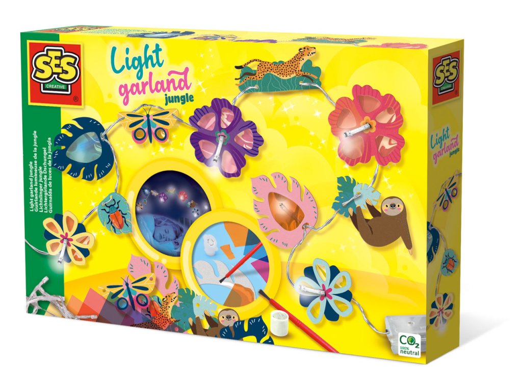 Vyrobte si svou vlastní světelnou girlandu z džungle do své ložnice. Tato sada obsahuje světelnou girlandu s osmi LED světly, pěti barevnými celofánovými listy, lepidlo, štětec, zvířátka z džungle a květiny. Spousta nástrojů k vytvoření dokonalé girlandy. Až půjdete večer spát, tato světelná girlanda z džungle krásně rozzáří váš pokoj. Baterie (2x AA) nejsou součástí balení. Věk: 6+