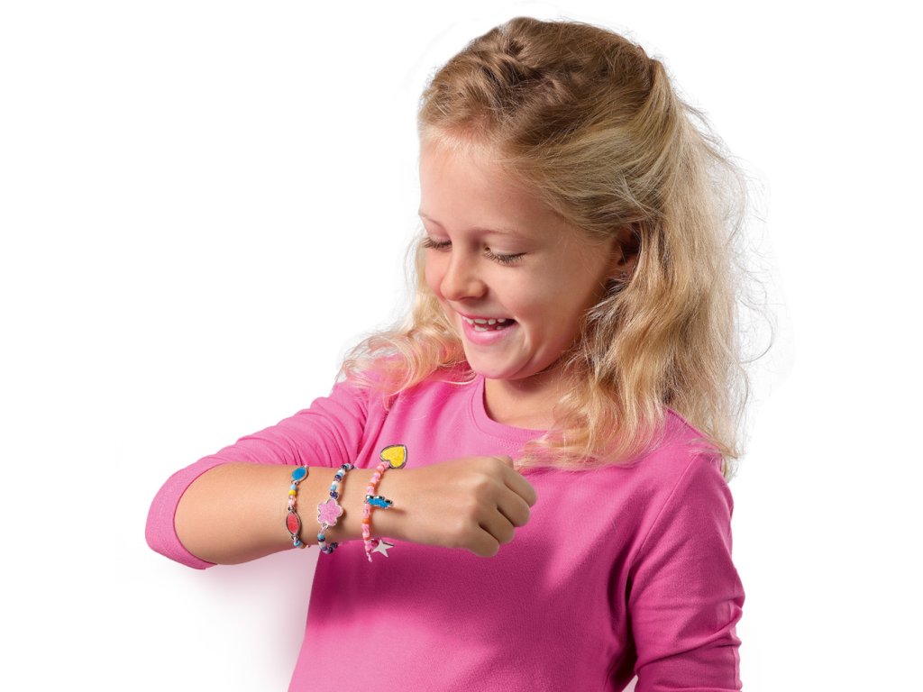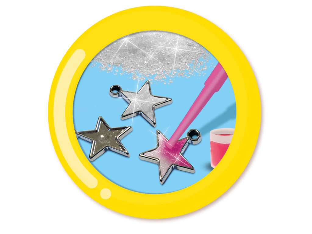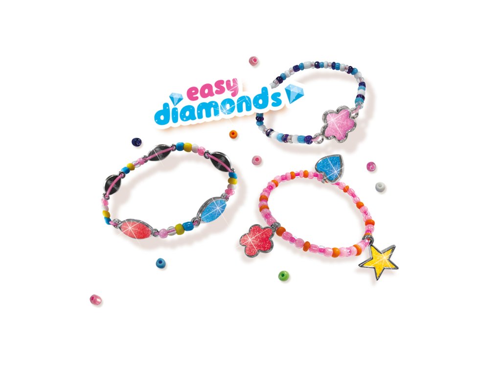 Také milujete výrobu šperků? S touto sadou SES si můžete snadno vyrobit krásné náramky se speciálními efekty. Naberte trošku diamantové prášku, vložte na stříbrný podklad diamantu a nakapejte na něj barvu, která se vám líbí. Díky barvě prášek ztvrdne a kouzlo je dokončeno! Navrhněte si své originální náramky. Sada obsahuje: 9 diamantů, diamantový prášek, 3 barevné roztoky, 3 odměrky, 3 pipety, elastická šňůrka, mix skleněných korálků, návod. Rozměr balení: 15 x 20 x 4 cm. Věk: 6+