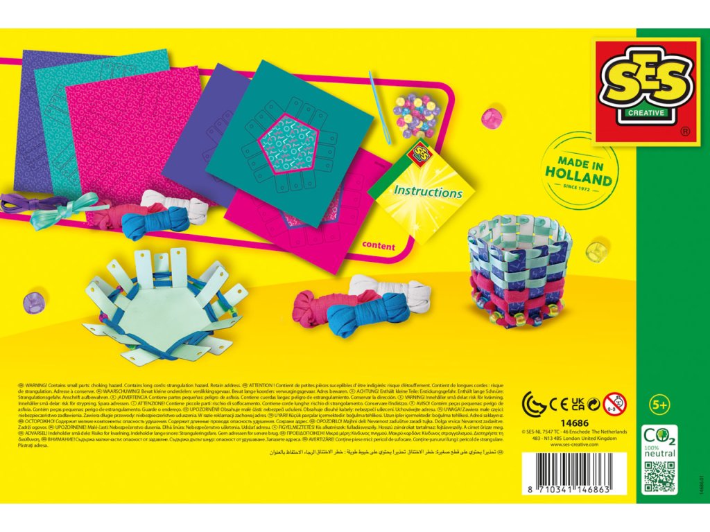 S touto sadou se snadno naučte plést košíky. Použijte papírové košíky jako základ a upleťte ty nejkrásnější košíky pomocí bezpečné plastové jehly a tříbarevné příze. Popusťte uzdu své kreativitě a ozdobte košíky korálky a saténoými stuhami. Praktické pro schování vašich malých pokladů. Sada obsahuje: 6 papírových dílů na košíky, 3 příze z tričkoviny, 2 saténové stuhy, korálky ve 4 barvách, plastová jehla. Věk: 5+