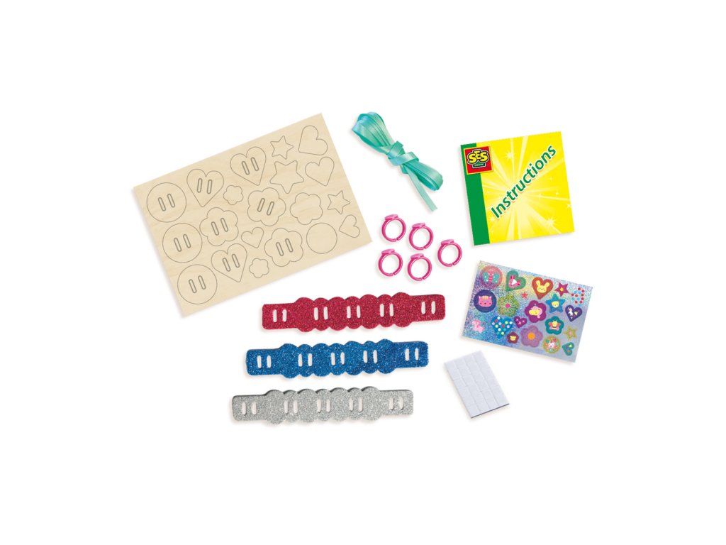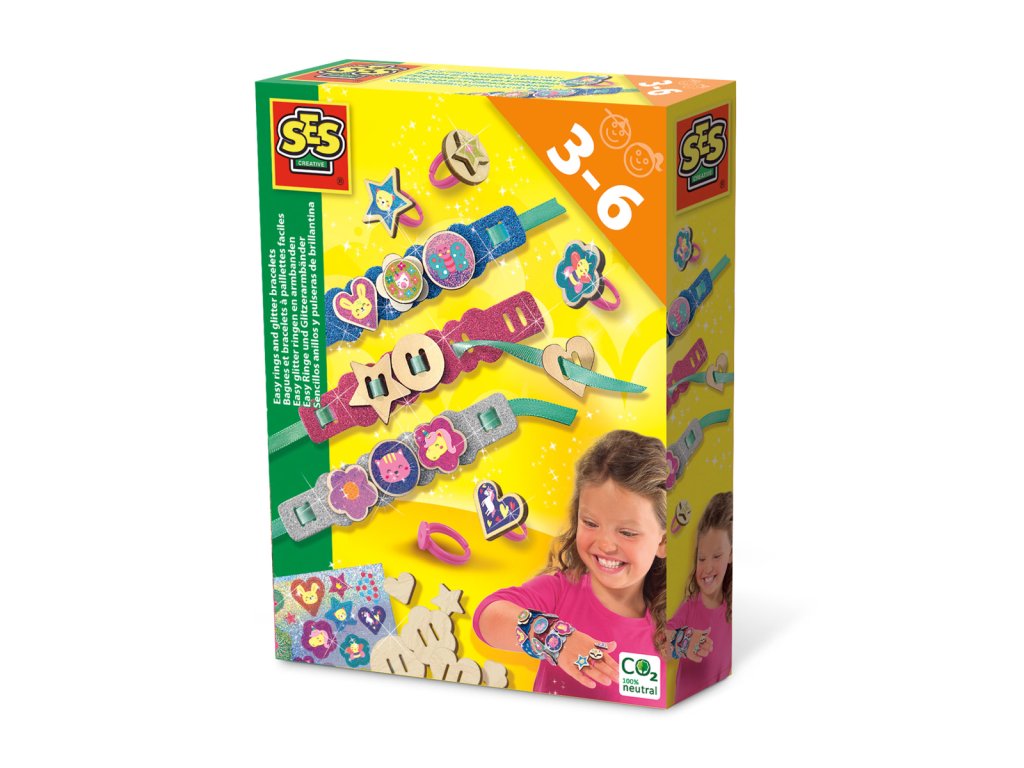 S touto sadou je snadné vyrobit si doma nádherné šperky. Se třemi třpytivými náramky a dřevěnými přívěsky můžete vytvářet různé náramky a prsteny, malovat přívěsky nebo nalepovat holografické nálepky na své prsteny a náramky. Tkaní, lepení samolepek a oslnění! Rozměry balení: 15x20x4cm. Věk: 3+