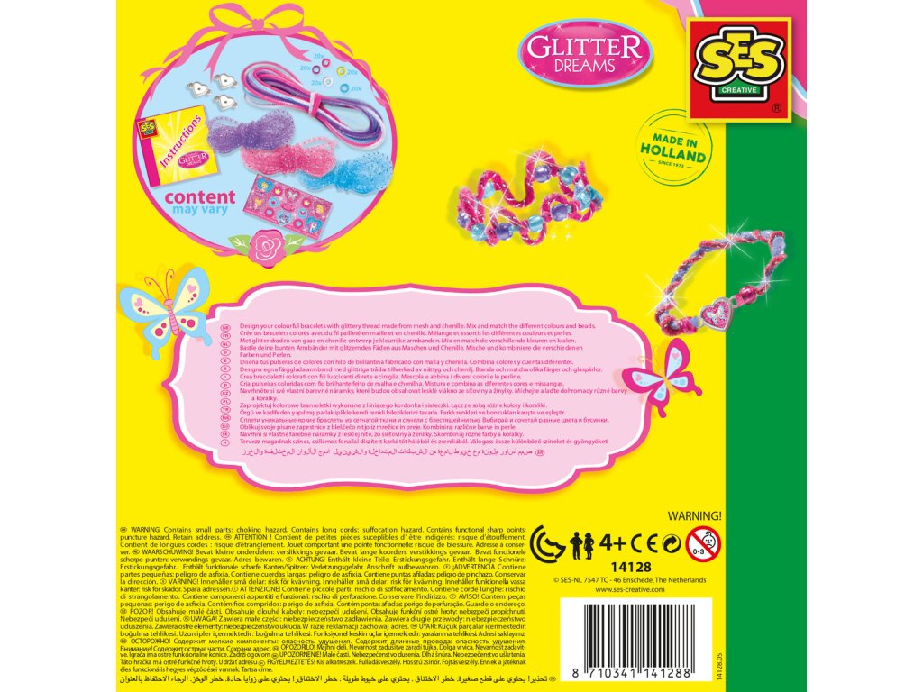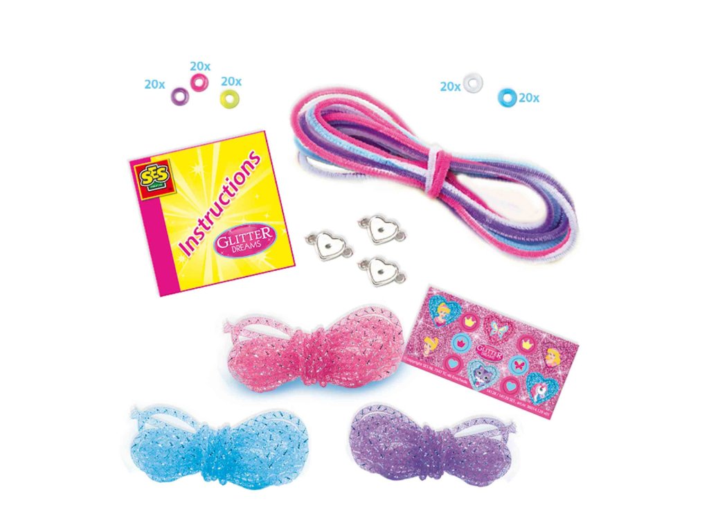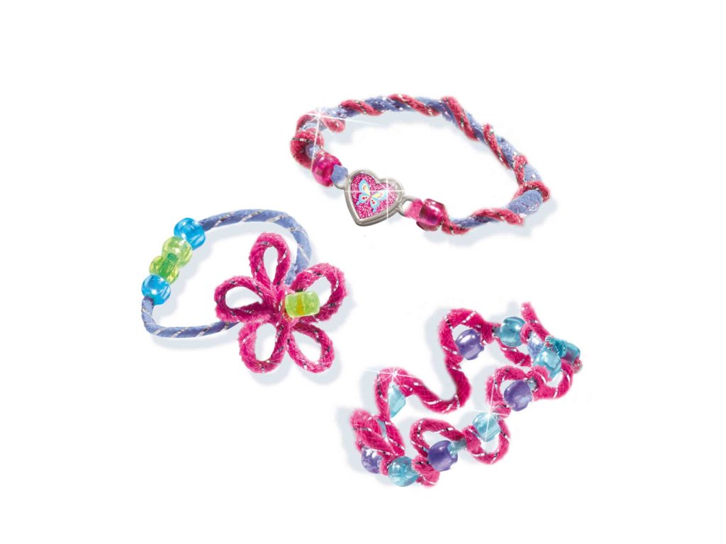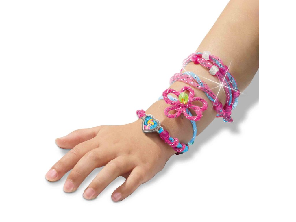 Kompletní sada pro výrobu krásných třpytivých náramků s motivem princezen – nesmí chybět v dívčí kreativní výbavě. Díky třpytivému drátku a žinylce si můžete samy navrhnout ty nejkrásnější náramky. Drátek a žinylku můžete použít různými způsoby – kroucení, splétání, uzlování, prostě to vyzkoušejte. Kombinujte různé barvy a korálky, přidejte přívěsky a získejte si pozornost. Obsahuje: 4 barvy žinylky, 3 barvy třpytivého drátku, 5 barev korálků, přívěsky, samolepky a návod k použití. Baleno v krabičce. Rozměry balení: 20 x 20 x 4 cm. Věk: 4+