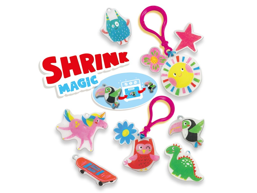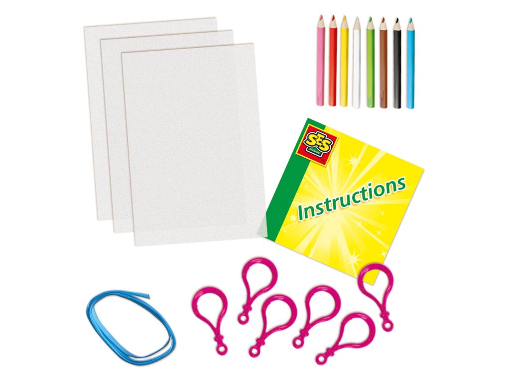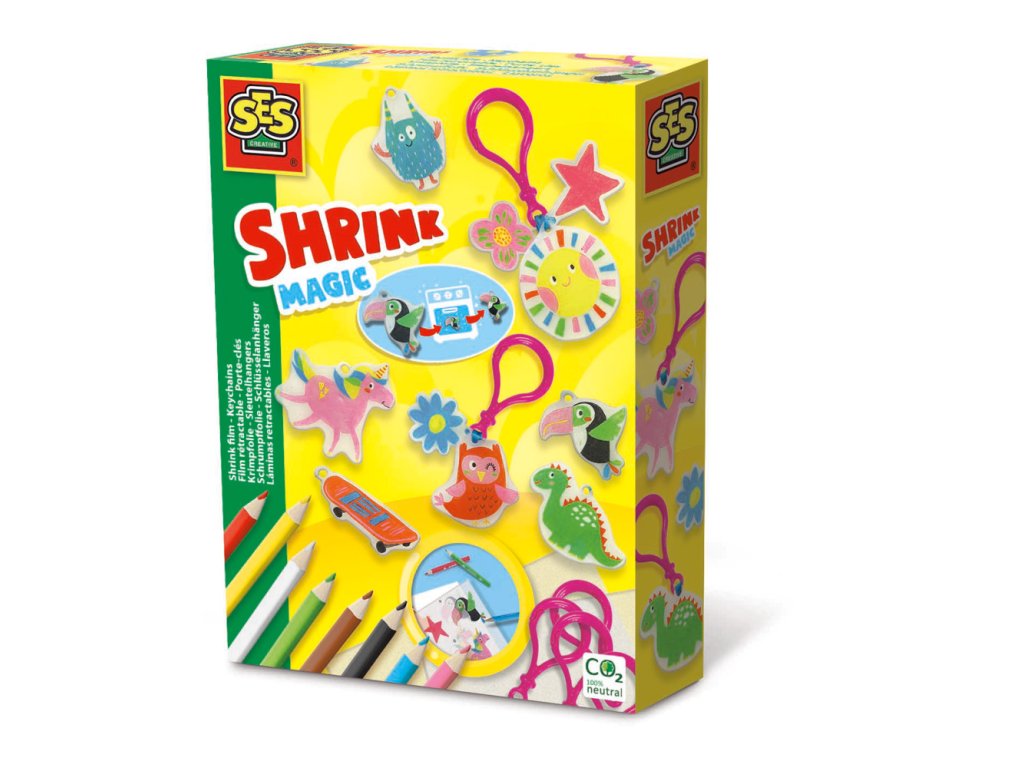 Objevte kouzlo smršťovací fólie. Tato sada SES obsahuje vše, co potřebujete k výrobě vlastních přívěsků na klíče. Nakreslete obrázky, vložte je do teplé trouby s sledujte, jak rychle se zmenšují. Obrázky jsou až sedmkrát menší! Nikdo nemá takovéto jedinečné přívěsky na klíče. Sada obsahuje: 3 smršťovací fólie, 8 barevných pastelek, 6 plastových kroužků na klíče, barevnou stužku, návod. Rozměr balení: 15 x 20 x 4 cm. Věk: 5+