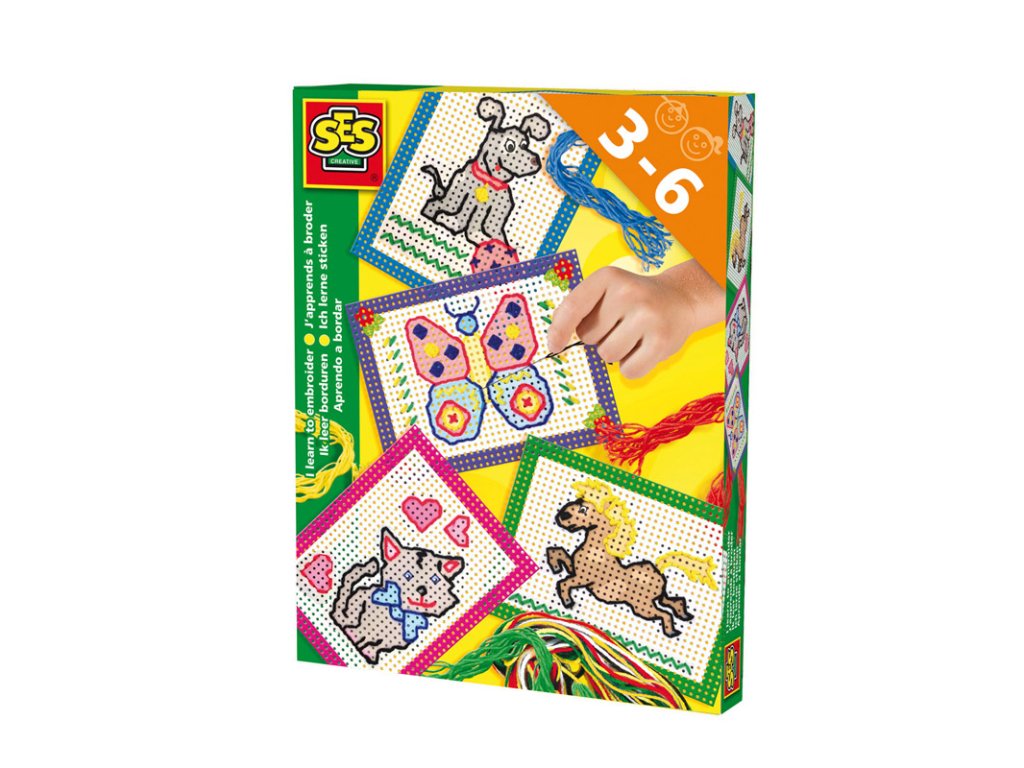Pevná děrovaná podložka pro vyšívání různých dětských, jednodušších motivů. Obsahuje 4 karty s předkreslenými motivy, tupou jehlu a bavlnky. Věk: 3+