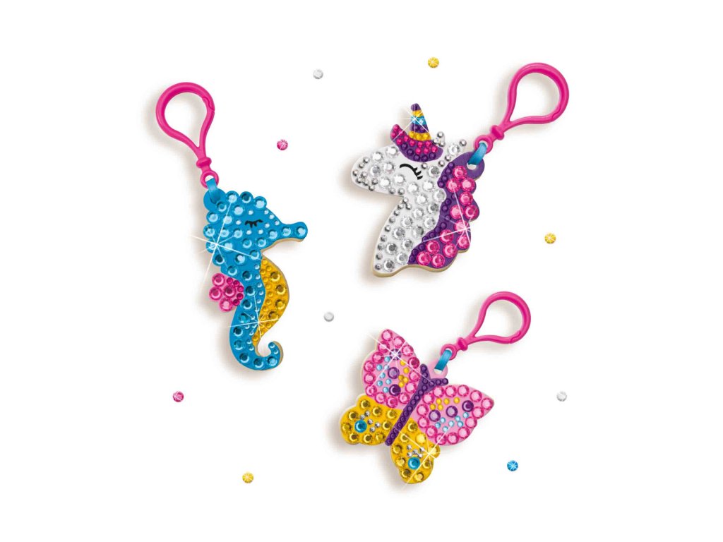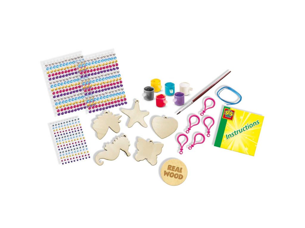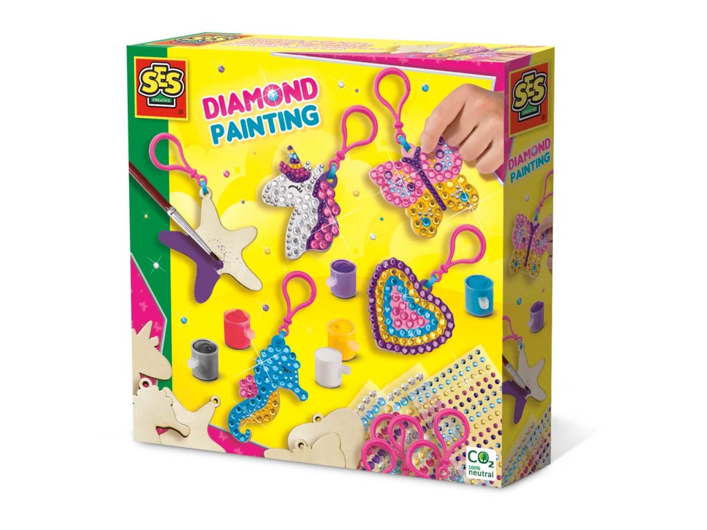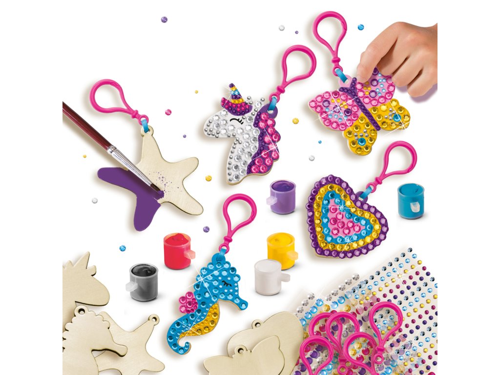 Vyrobte si veselé diamantové klíčenky, které rozzáří vaše klíče nebo batoh. Perfektní dárek pro vaše přátelé. Nejprve natřete dřevěné figurky barvami, které se vám nejvíce líbí. Počkejte, až vše zaschne, a pak na ně můžete nalepit diamantové samolepky. Stimuluje kreativitu a jemnou motoriku. Obsah: 360 diamantů v 5 barvách, 200 diamantů mini v 5 barvách, dřevěné postavičky, 6 plakátových barev, štětec, 5 plastových kroužků na klíče, světle modrá saténová stuha a návod k použití. Baleno v krabičce. Rozměry balení: 20 x 20 x 4 cm. Věk: 5+
