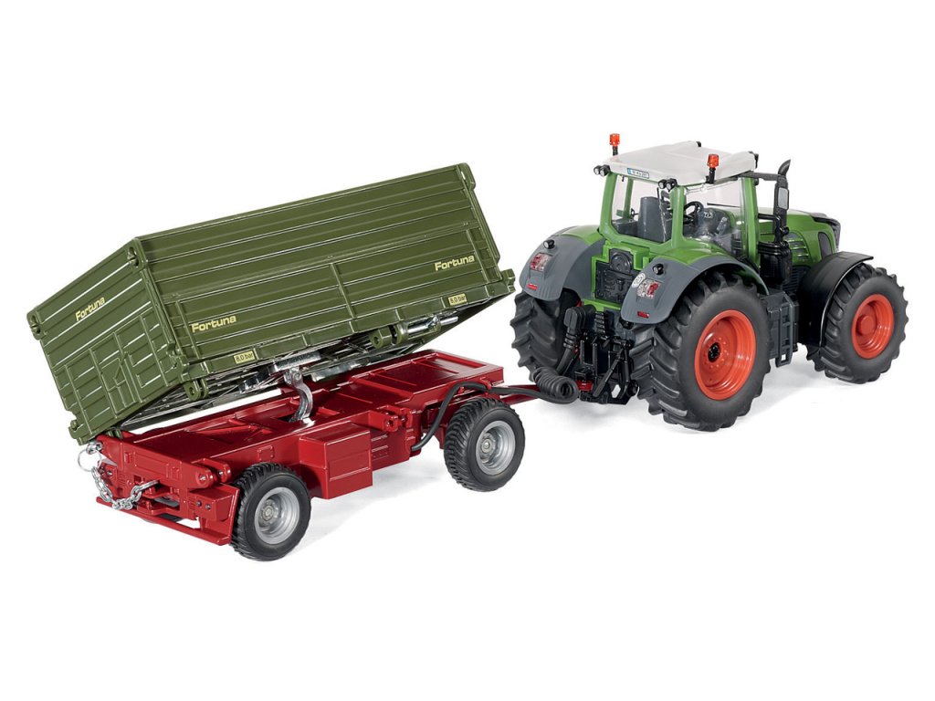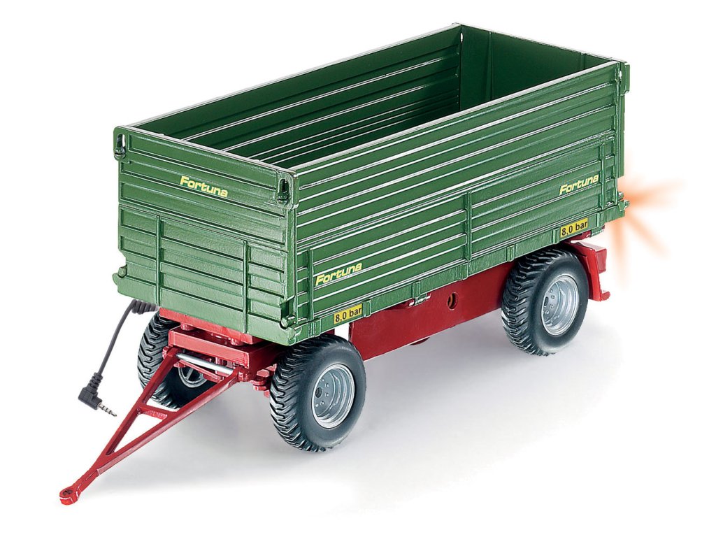 Elektronicky ovládaný dvoustranný sklopný valník s otočnou deskou a tažnou tyčí. Přívěs má vlastní napájení z baterie a je připojen k traktoru datovým kabelem. Sklápěč přívěsu lze elektronicky naklonit doprava i doleva. K aktivaci této funkce lze použít stávající dálkový ovladač. Na zadní části přívěsu vytvářejí červené a oranžové LED diody zadní světla a ukazatele. Díky nezávislému zdroji energie může být přívěs provozován také bez ovládacího traktoru nebo prostřednictvím dálkového ovladače. Na modelu jsou namontovány příslušné spínače, aby bylo možné ovládat naklápění a světla. Sklopný valník s akumulátorovou baterií vhodný k připojení za některý z traktorů řady SIKU CONTROL. Model je kompatibilní jak s RC dálkovým ovladačem pracujícím na frekvenci 2,4 GHz, tak s IR dálkovým ovladačem. Měřítko: 1:32. Rozměr: 230 x 81 x 99 mm. Věk: 3+