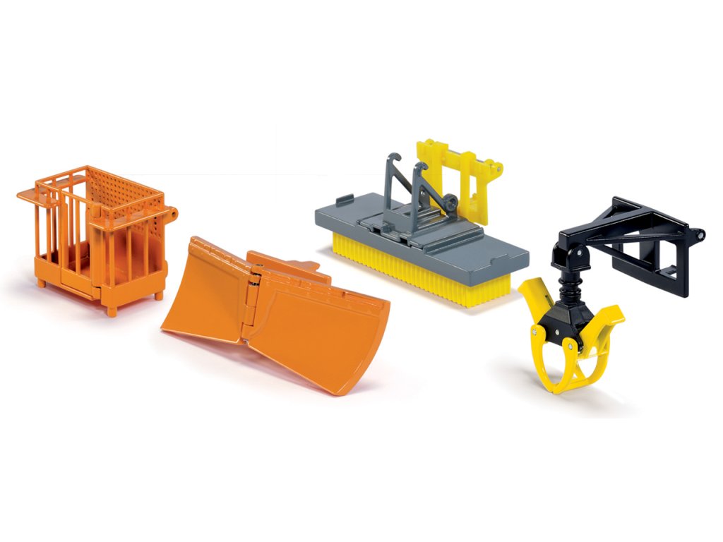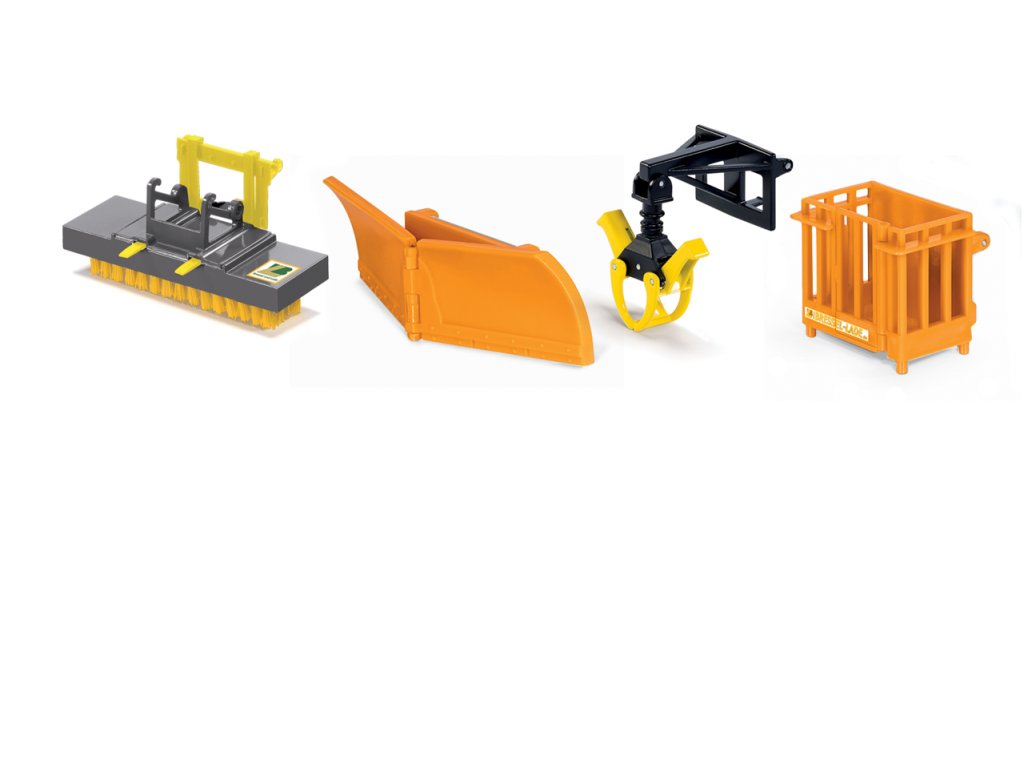 Řada upevňovacích zařízení pro traktory SIKUFARMER32 s předními nakládači. Skládá se s pracovní plošiny, sněhového pluhu, zametacího kartáče a naběrače kmenů stromů. Pracovní plošina je také vybavena dveřmi. Sněžný pluh se může pohybovat zleva doprava a všechny tři sběrače kmenů mají volně pohybující se ´´drápy´´. Charakteristickým rysem zametacího kartáče je dodaná paletová vidlice. Ta může být použita k vyzvednutí kartáče. Hroty paletové vidlice Fendt 939 Vario s čelním nakládačem traktoru z řady SIKUCONTROL32 také pasují do držáku zametacího kartáče. Měřítko: 1:32. Rozměr: 210 x 131 x 59 mm. Rozměr balení: 21 x 13,1 x 5,9 cm. Věk: 3+