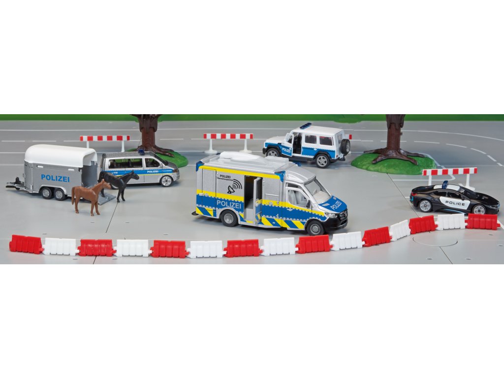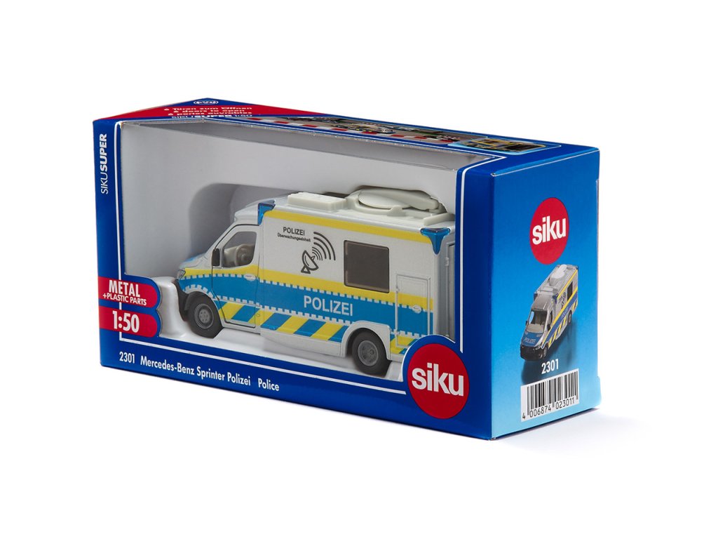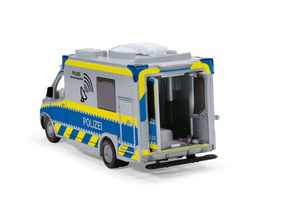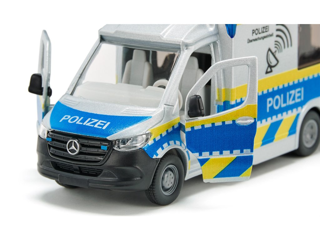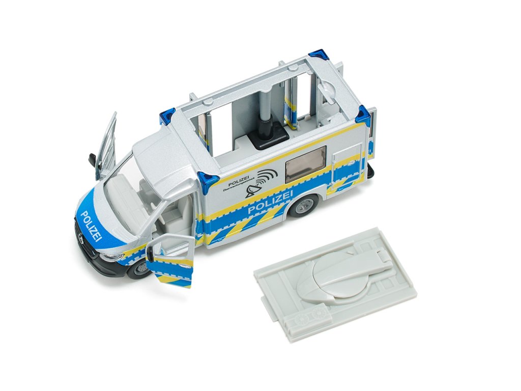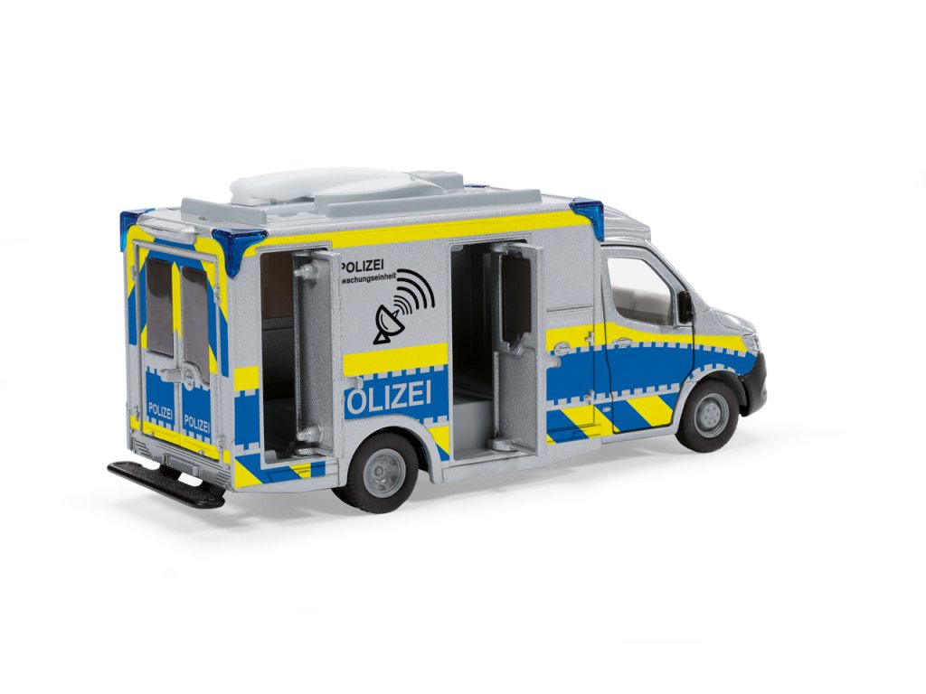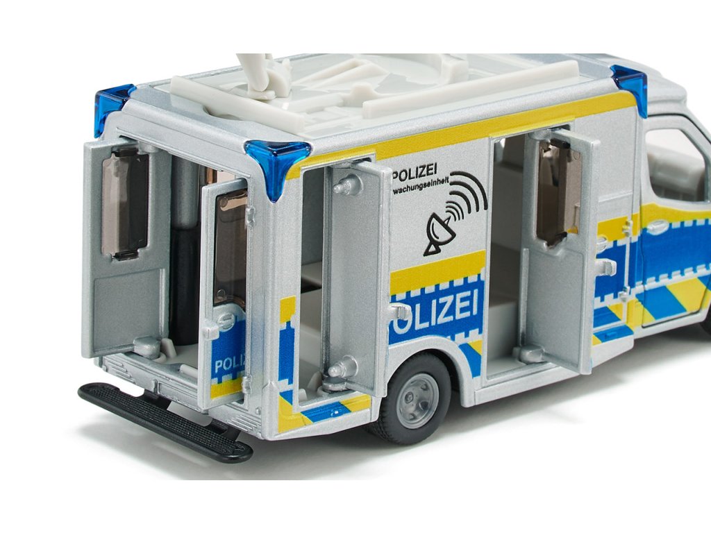 Čím složitější je policejní operace, tím důležitější je spolehlivá komunikace mezi pracovními skupinami. Interakce prostřednictvím satelitu funguje rychle a hladce, dokonce i v krizových nebo katastrofických situacích. Policejní sprinter siku od Mercedes Benz je vybaven odpovídajícím vybavením. Otočnou satelitní anténu na její střeše lze během cestování sklopit. Dveře na obou stranách kabiny řidiče lze otevřít, stejně jako dvoje dveře na pravé straně a vzadu. Rohy skříňové nástavby jsou označeny čtyřmi modrými světly. Typické stříbrno-modré zbarvení Police Sprinter je doplněno celoobvodovým žlutým signálním značením a také nápisy „Polizei“. Rozměry balení: 17,5 x 8,7 x 5,9 cm. Věk: 3+