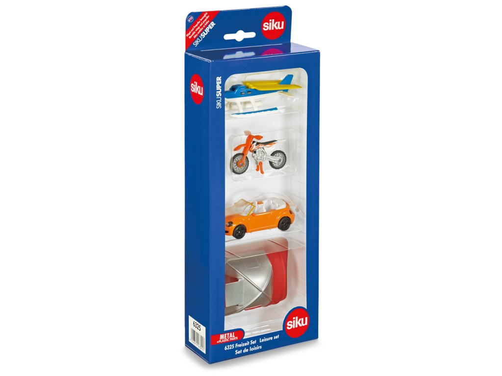 SIKU Super – set vozidla a příslušenství pro volný čas. Na břehu jezera je zaparkovaný oranžový kabriolet hned vedle velkého stanu s baldachýnem. Nedaleko startuje hydroplán. Sada obsahuje hydroplán se sklopnými křídly, motokrosové kolo KTM s pneumatikami a hlubokým vzorem, se stojánkem a pohyblivými řídítky a kabriolet se sportovními ráfky a pogumovanými pneumatikami. Rozměr balení: 29,6 x 11 x 4,8 cm. Věk: 3+