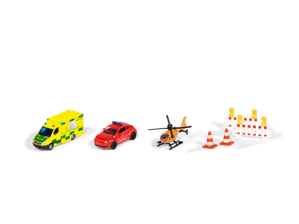 V nouzi se počítá každá vteřina. Je proto důležité, aby se na místo rychle dostala záchranná služba. Ať už na cestách nebo ze vzduchu – se sadou Rescue od siku brzy dorazí pomoc, protože záchranáři jsou již na cestě! Sada se skládá ze tří modelů vozidel a různého příslušenství. VW Beetle s mezinárodním označením „Ambulance“ funguje jako vozidlo pohotovostního lékaře. Má červený nátěr pohotovostní služby a na střeše tyč nouzového osvětlení. Dveře vozidla lze otevřít. Záchrannému vozidlu rychle pomáhá vyprošťovací vozidlo, jasně žlutý Mercedes Sprinter s podrobným vícebarevným signálním značením a zeleným nápisem „Ambulance“ po stranách. Pro leteckou podporu je nasazen i vrtulník. Jeho rotorové listy lze složit a rotor lze otáčet. Pro zabezpečení místa nehody sada dále obsahuje dvě výstražné zábrany a dva oranžovo/bílé kužely. Rozměry balení: 29,6 x 11 x 4,8 cm. Věk: 3+