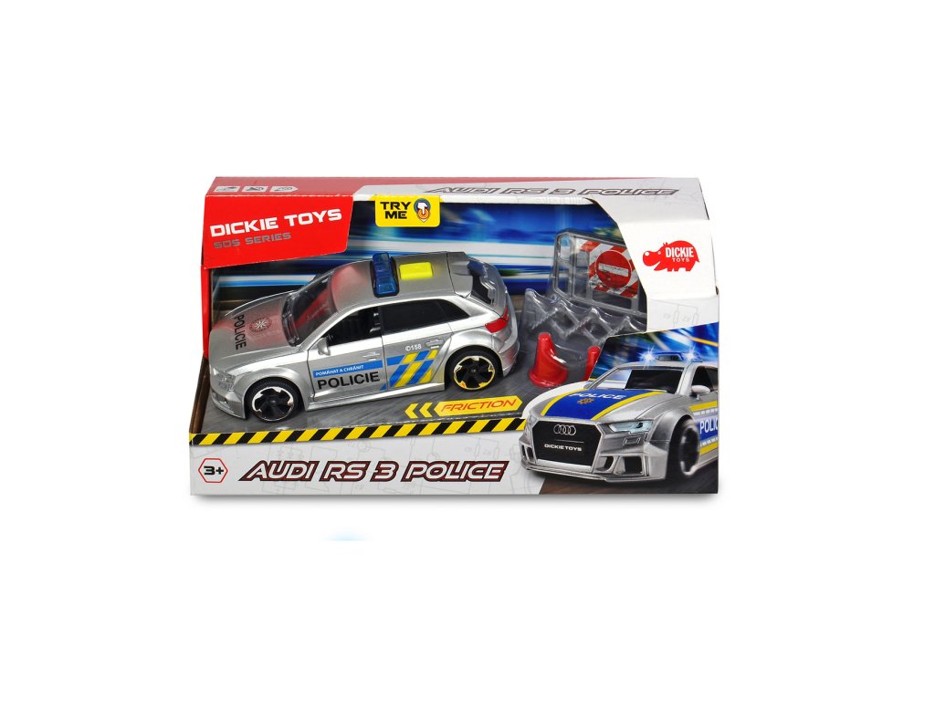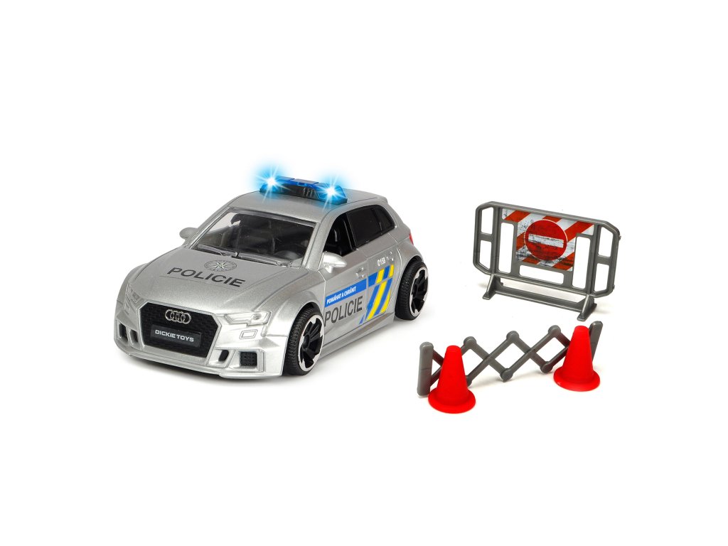 Policejní auto Audi RS3 na setrvačník, se světelnými a zvukovými efekty a otevíracími dveřmi. Příslušenství - zastavovací pás, dopravní kužely, zábrana. Velikost 15 cm, měřítko 1:32. Česká verze.
