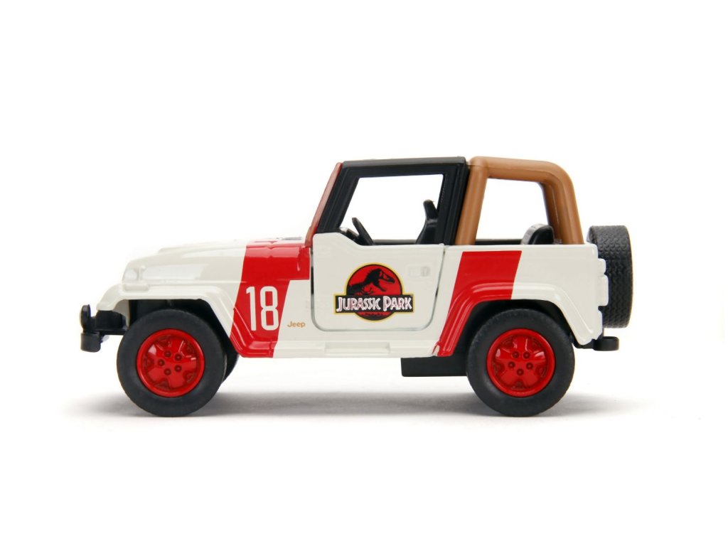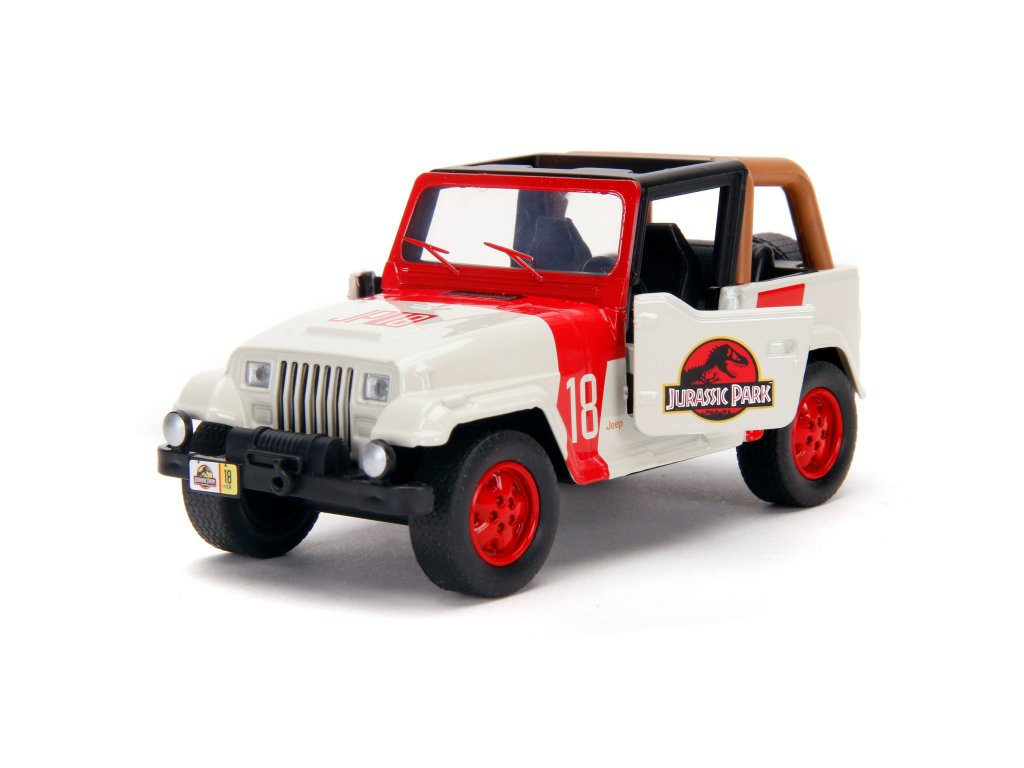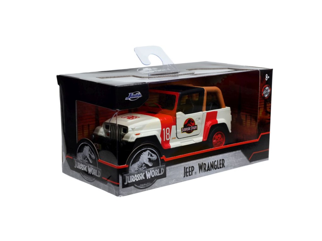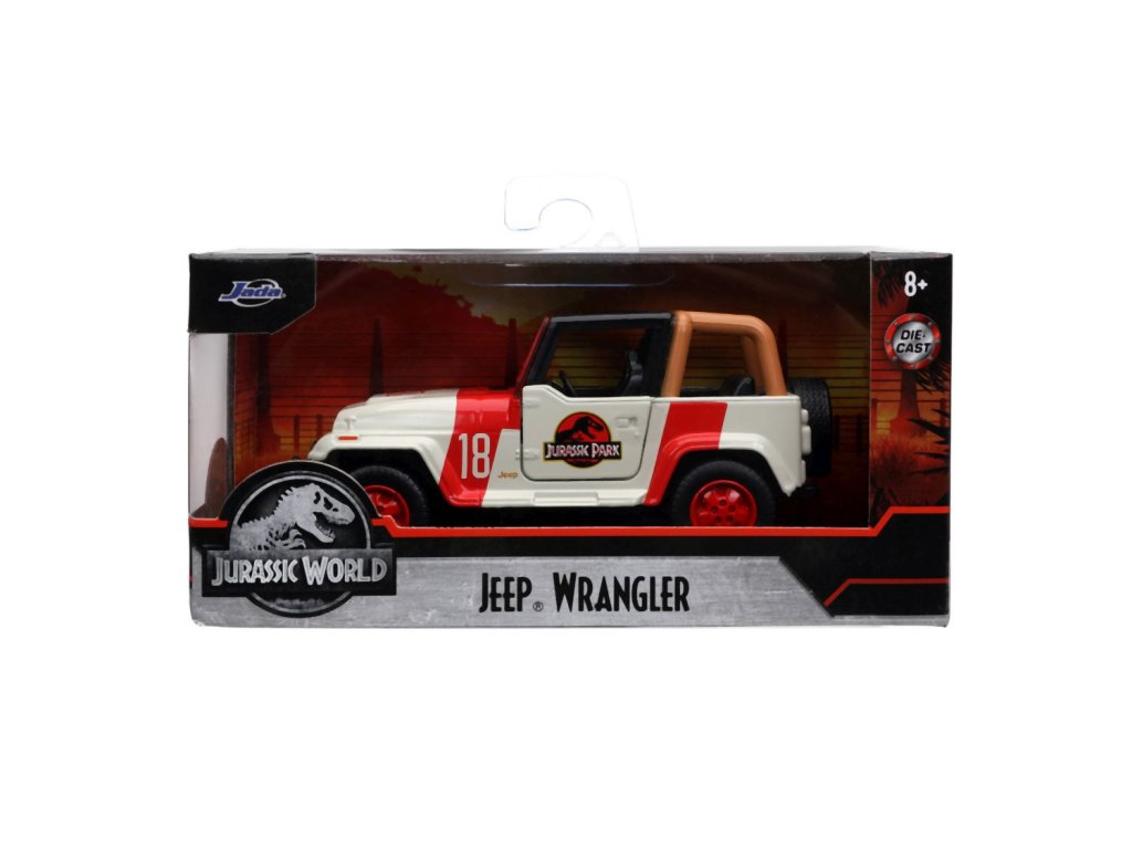 Kovový model auta Jeep Wrangler Jurassic World 1:32, na volnoběh, otevírací dveře. Velikost 10,2 cm. Displej obsahuje 6 ks.