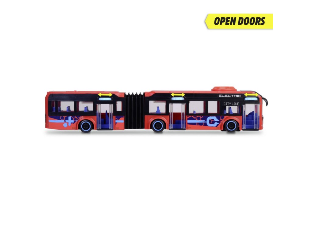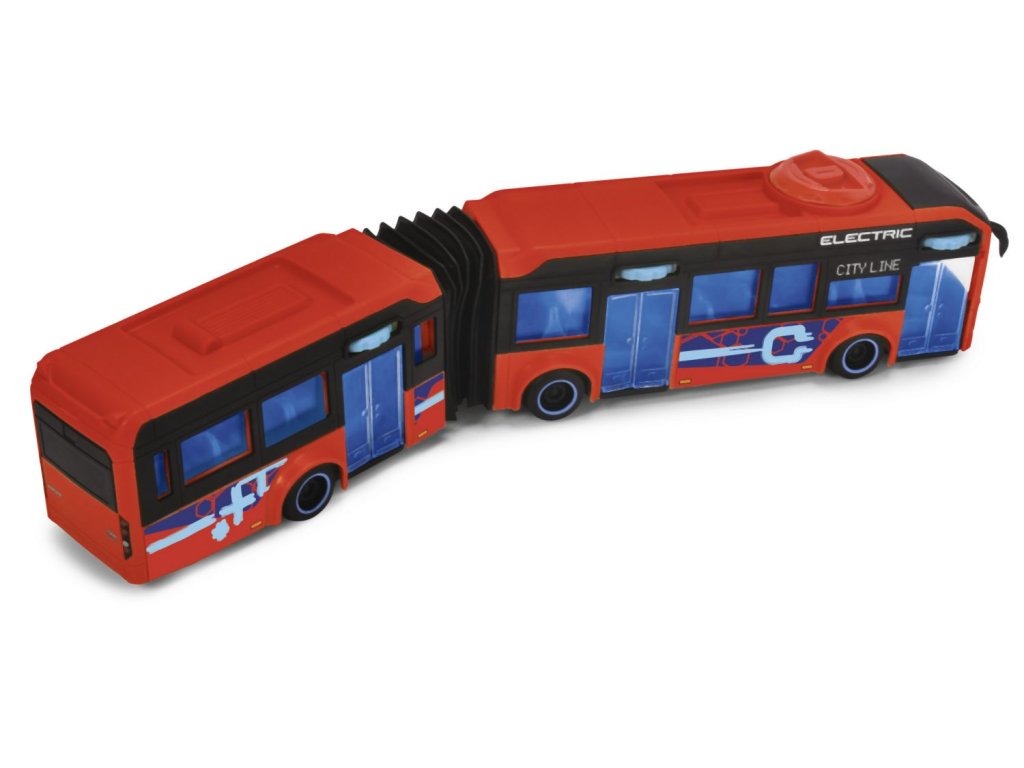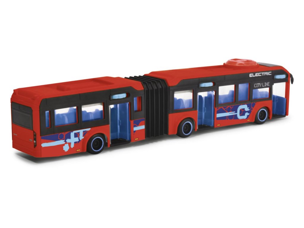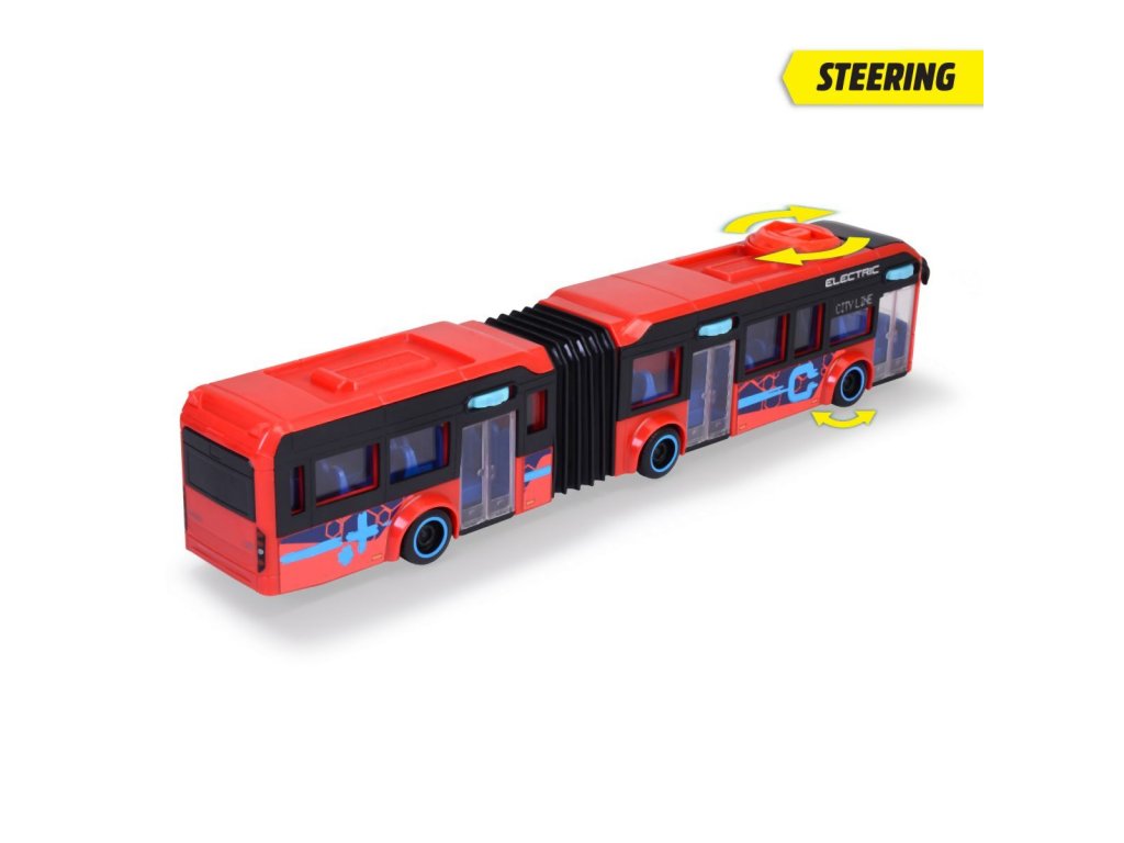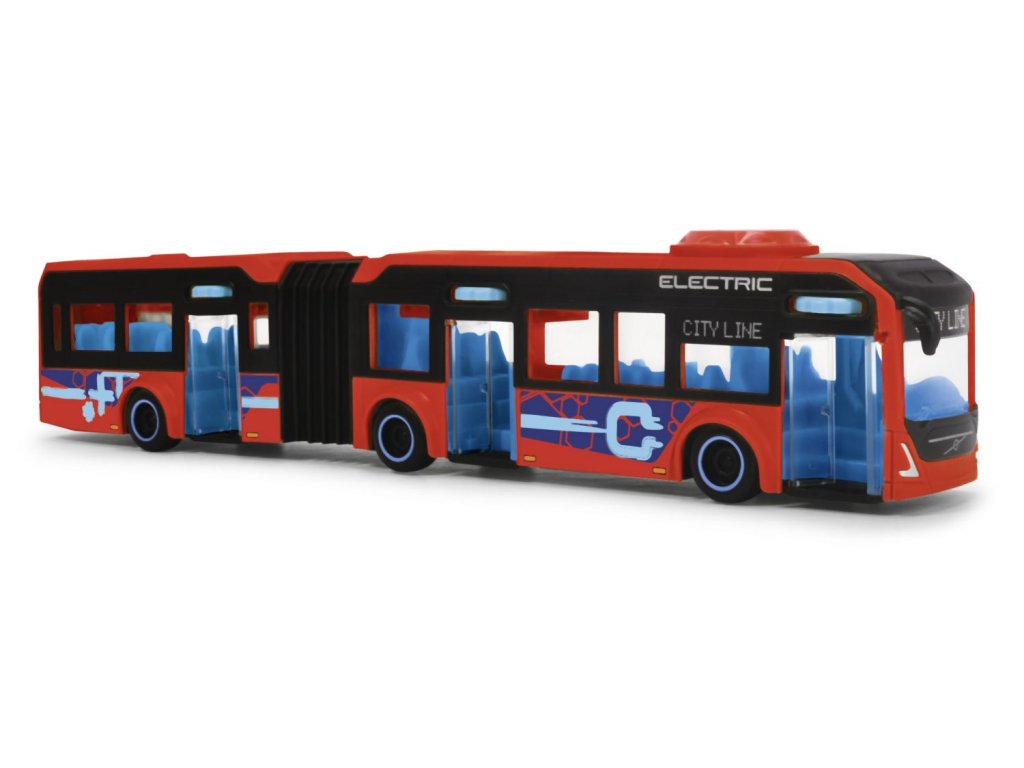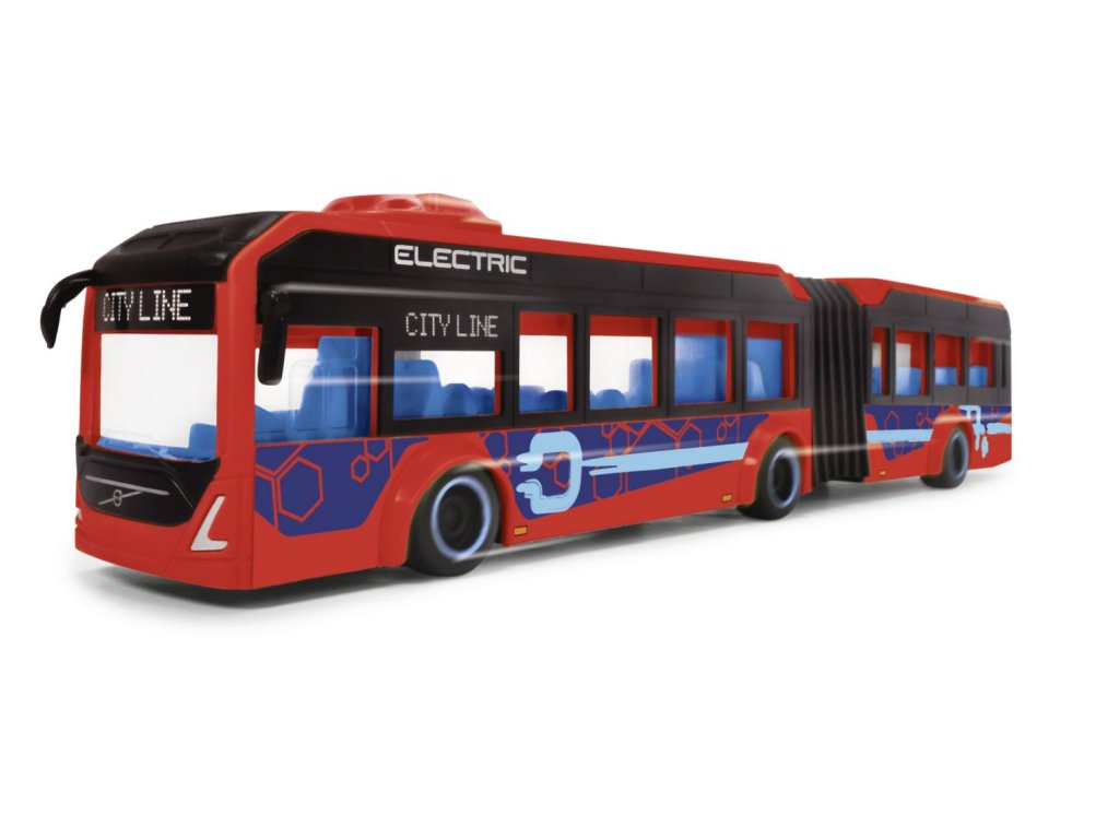 Autobus Volvo 7900E na volnoběh, otáčením kolečka na střeše se ovládají přední kola, otevírací dveře. Délka 40 cm.