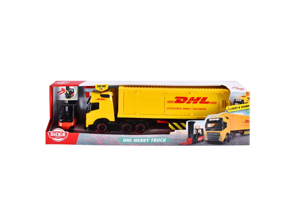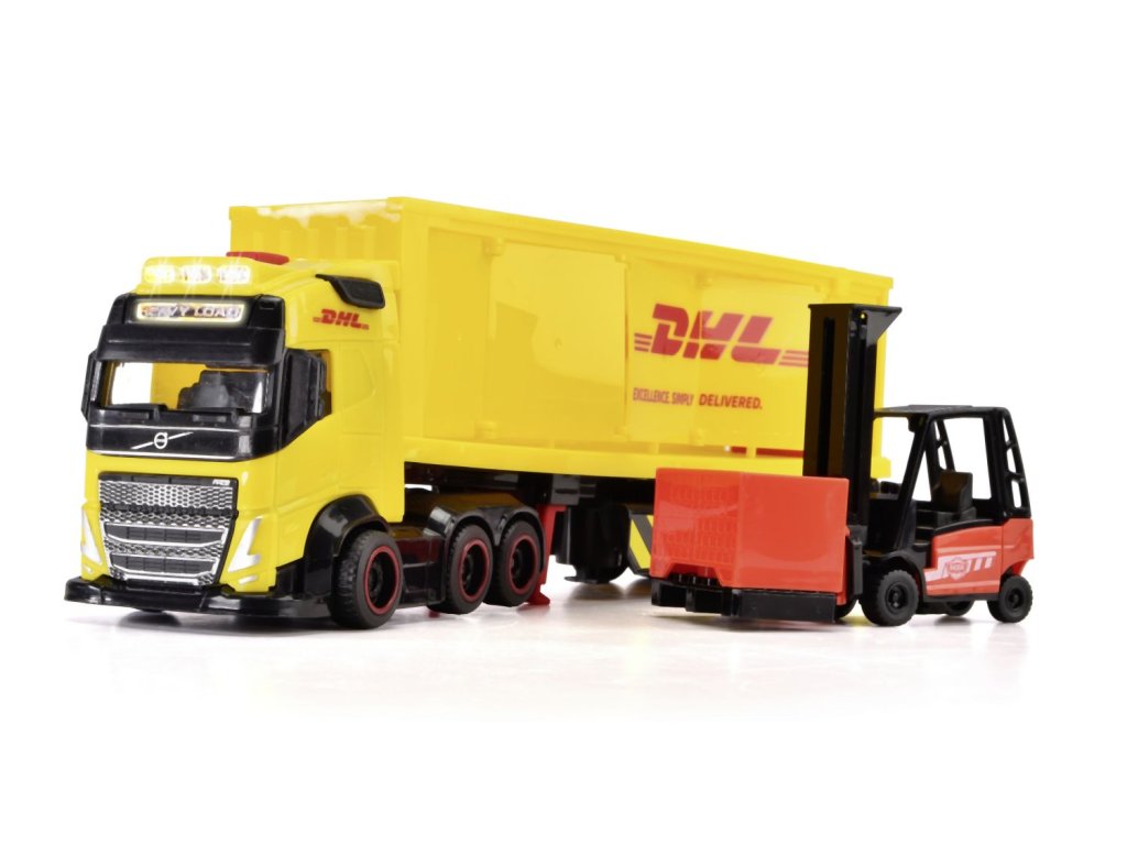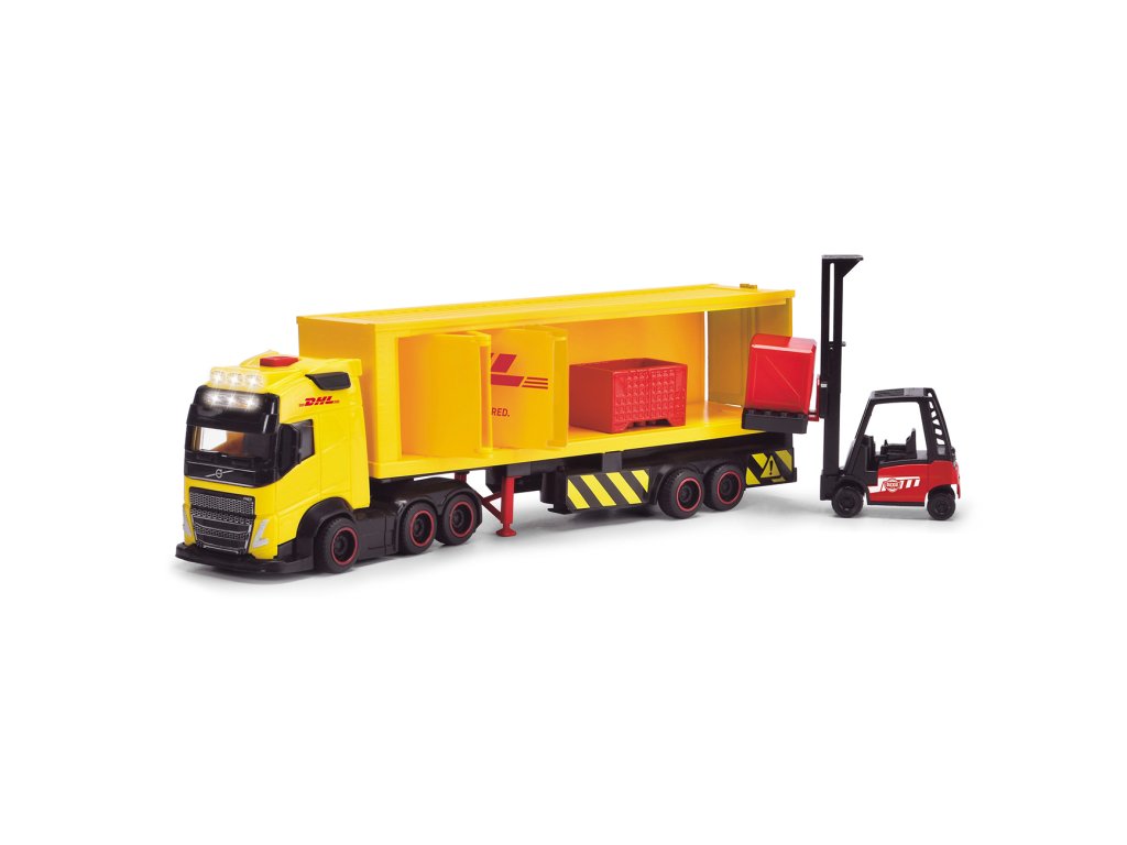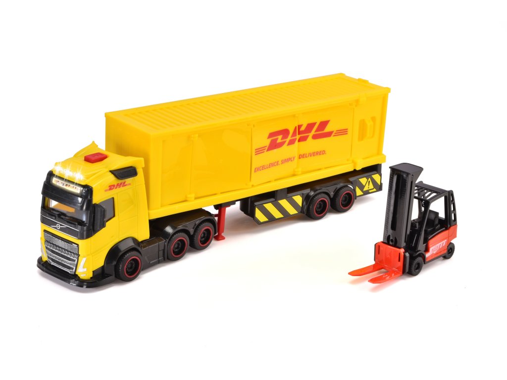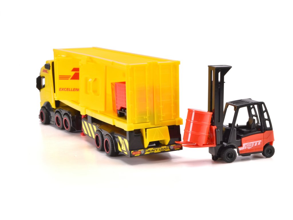 Nákladní vůz DHL Volno FH 16 na setrvačník se světelnými a zvukovými efekty a pohyblivými díly. Součástí kontejnerový příves a vysokozdvižný vozík na volnoběh, 12 cm. Délka 35 cm, barva žlutá/červená.