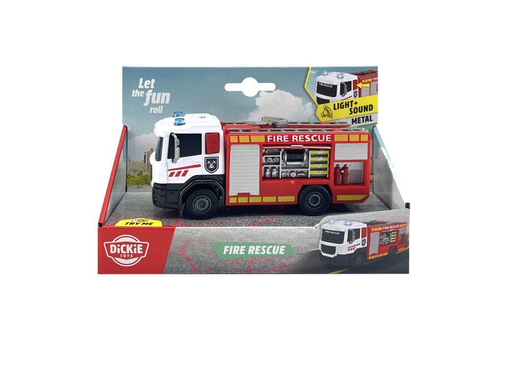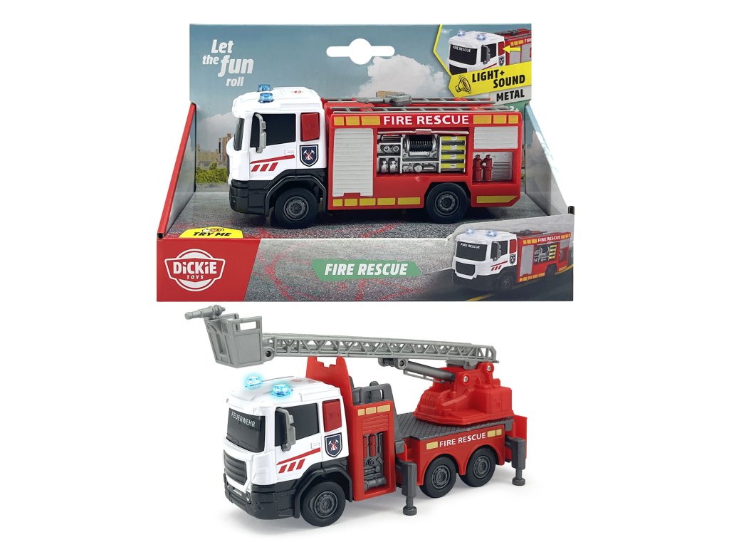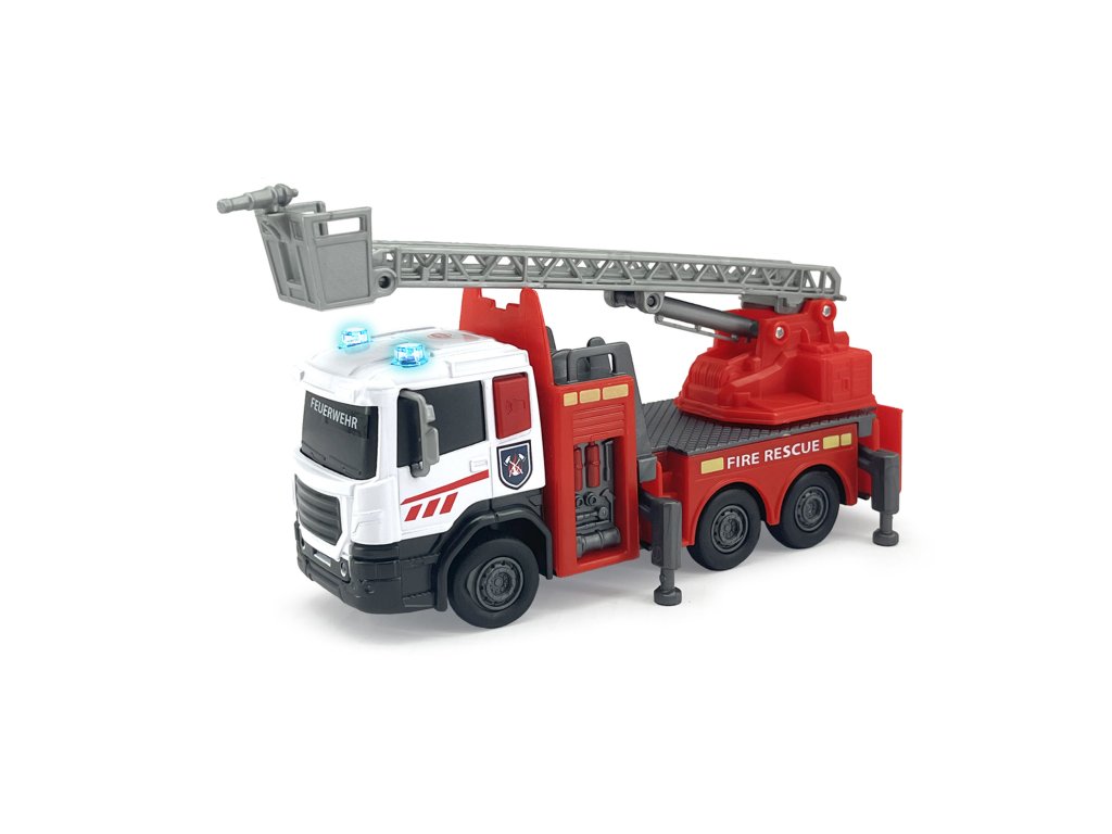 Hasičské auto na volnoběh, světelná a zvuková fnkce, kovová kabina, pohyblivé části. Délka 17 cm. 2 druhy: s otevíracím bokem nebo s výsuvným žebříkem.