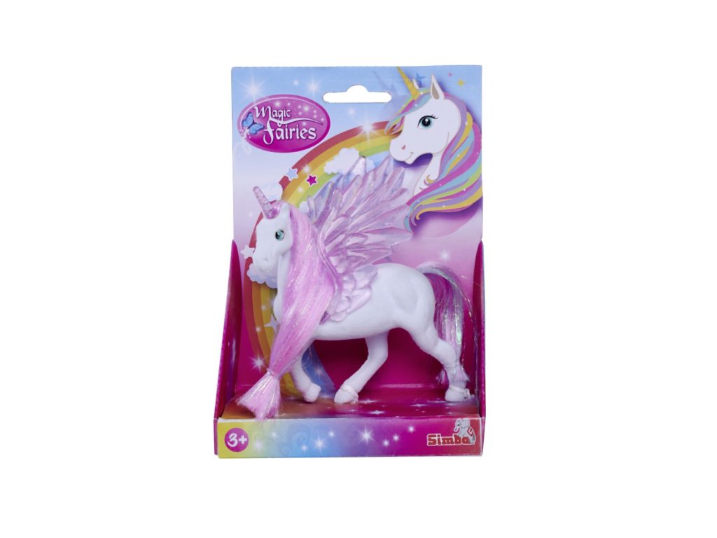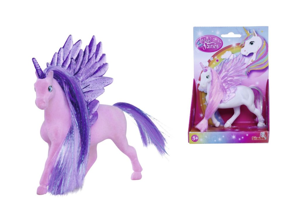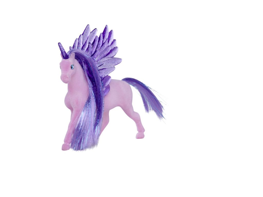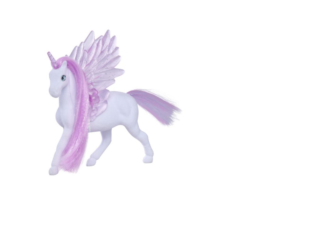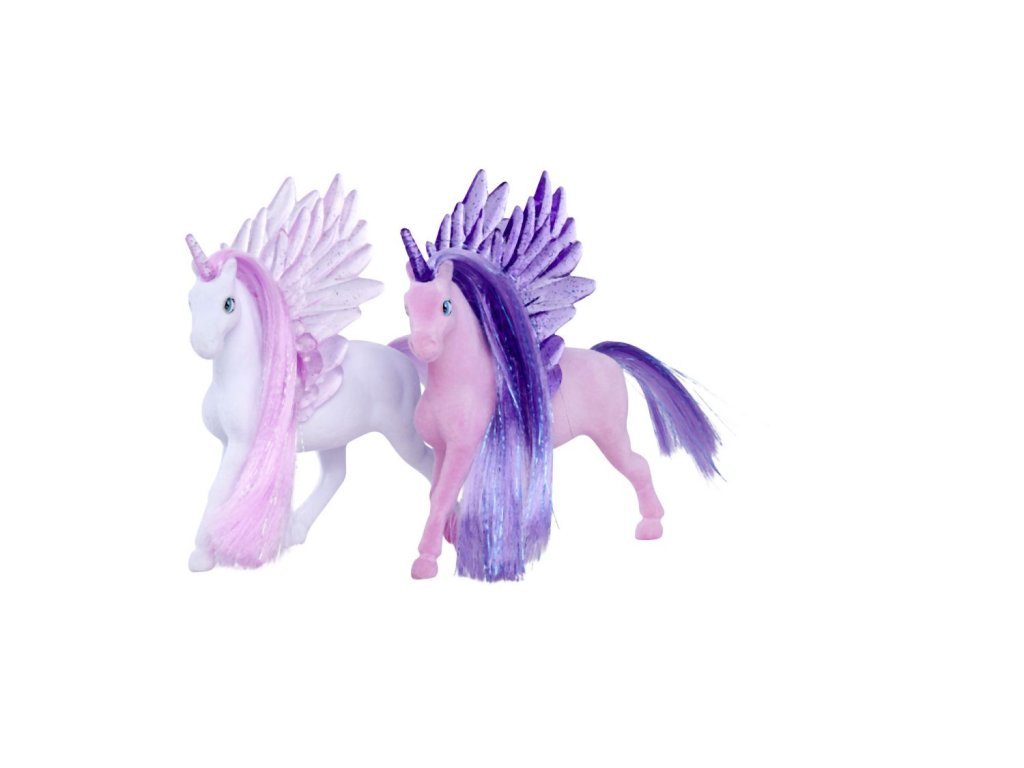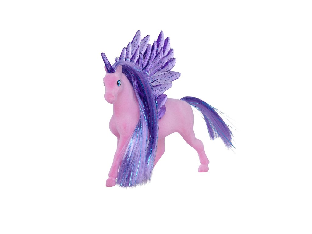 Figurka jednorožce s třpytivými poloprůhlednými křídly a rohem. 2 druhy. Velikost 11 cm.