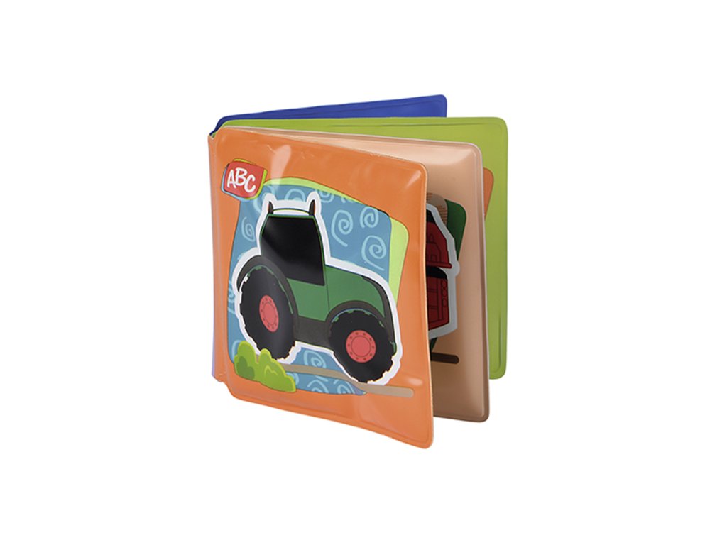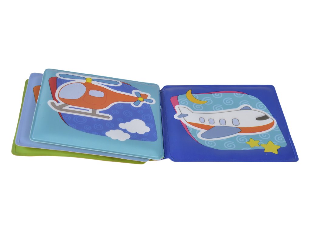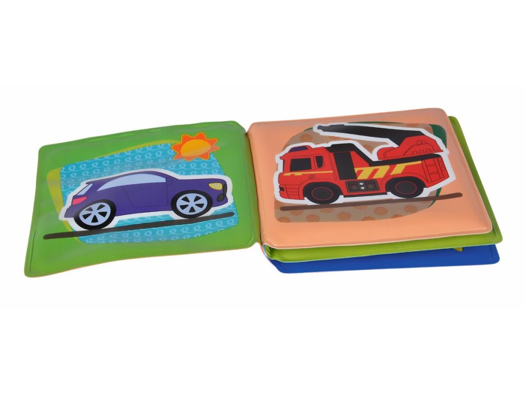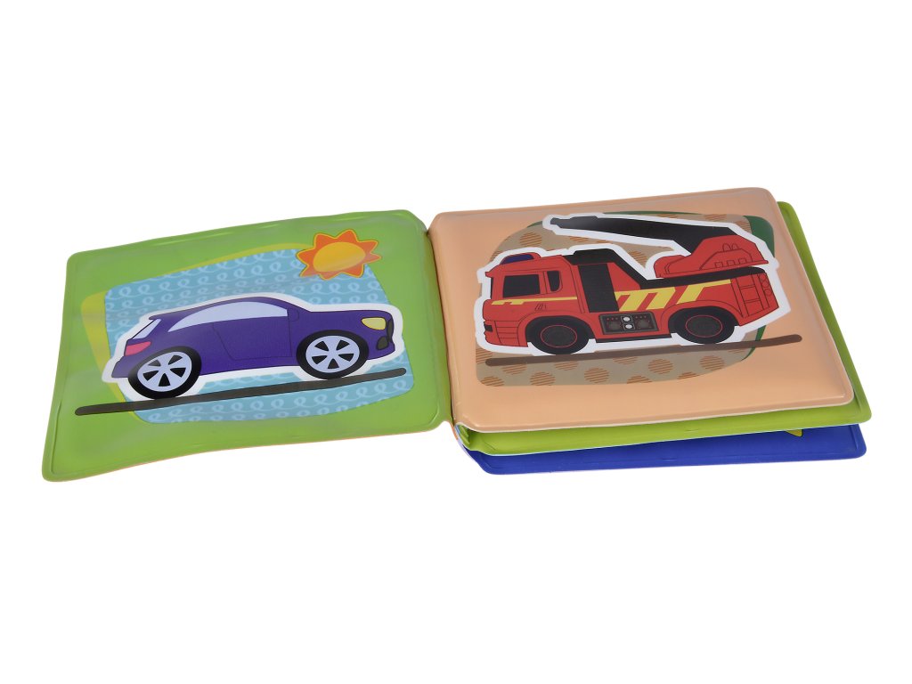 Omyvatelná knížka pro nejmenší s "pískátkem" na přední straně. Má celkem 8 stran s obrázky dopravních prostředků. Rozměr zavřené knížky: 10x10cm.