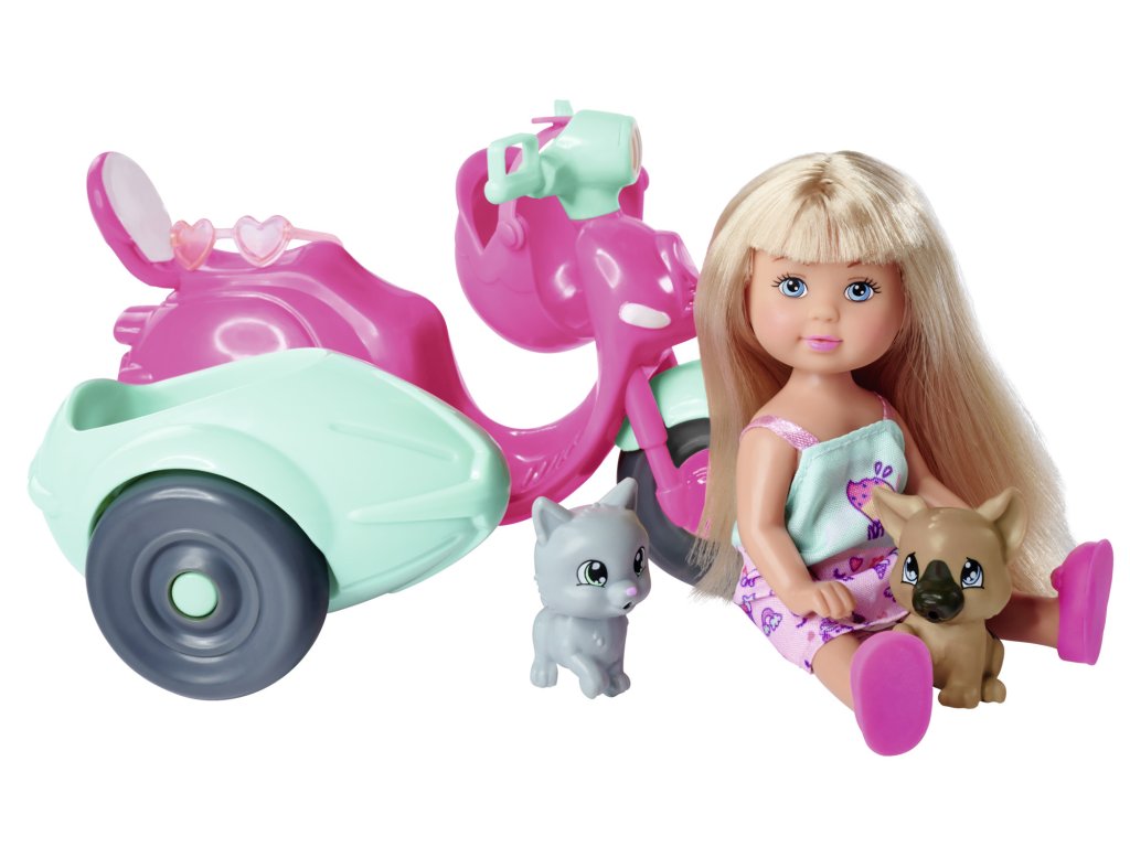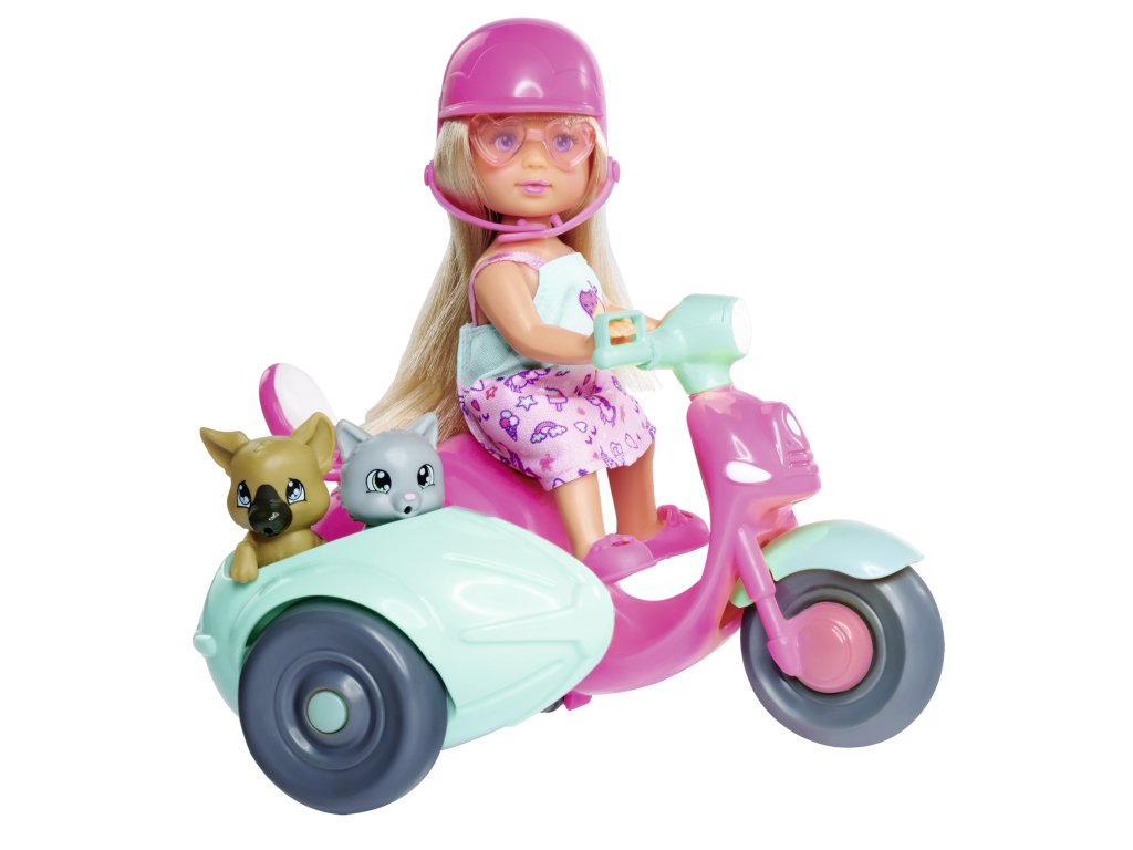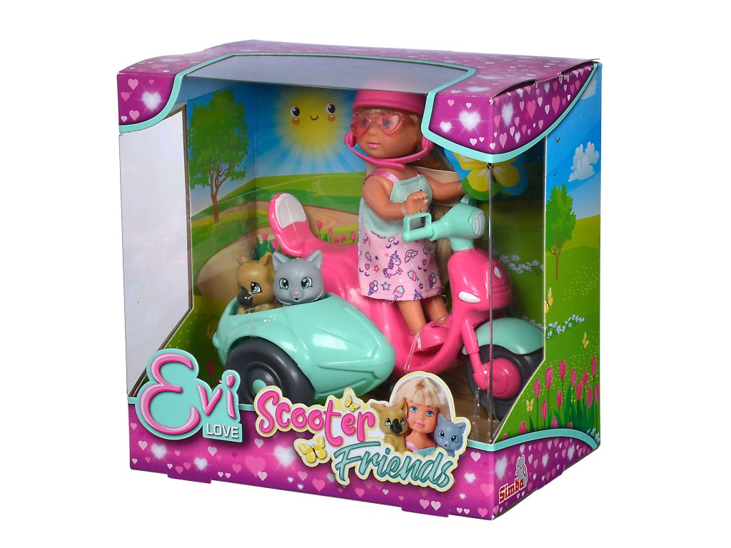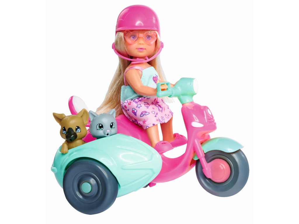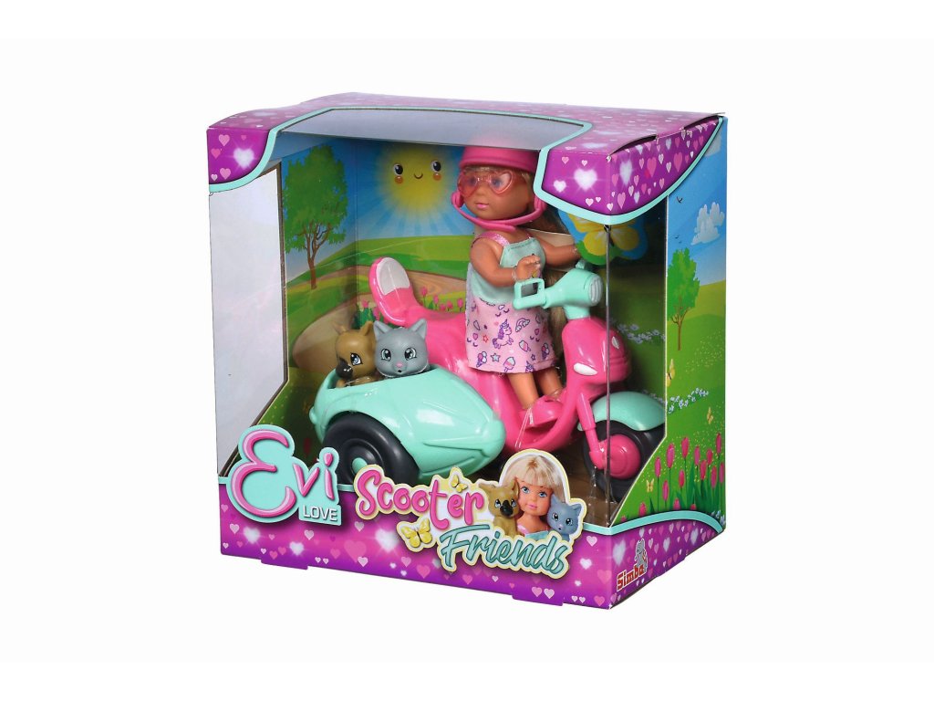 Panenka Evička se skútrem a sajdkou pro svezení mazlíčků. Výška panenky 12 cm.